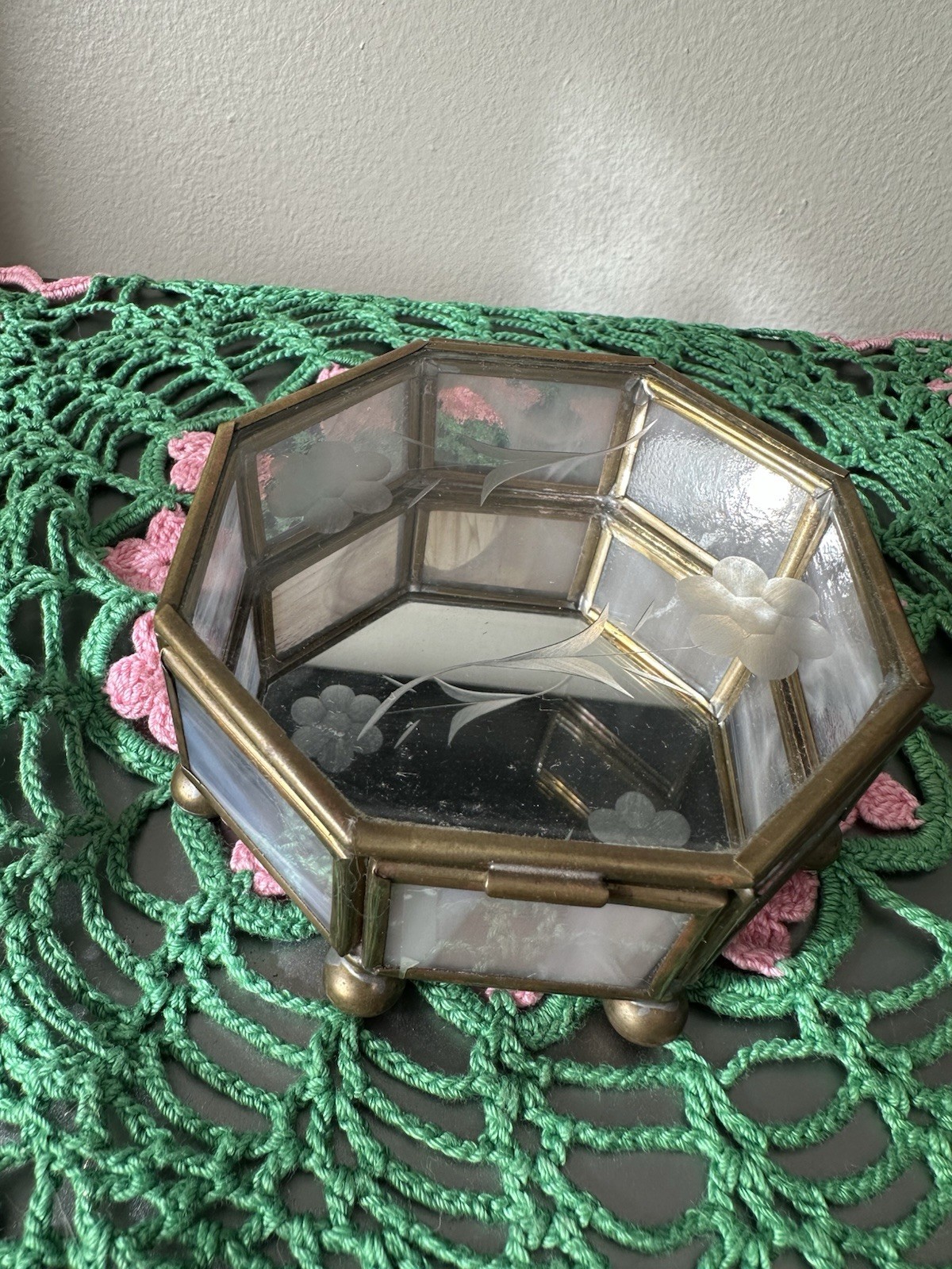 • Vintage Glass Brass Mirror Bottom Floral Etched Octagon Trinket Jewelry Box