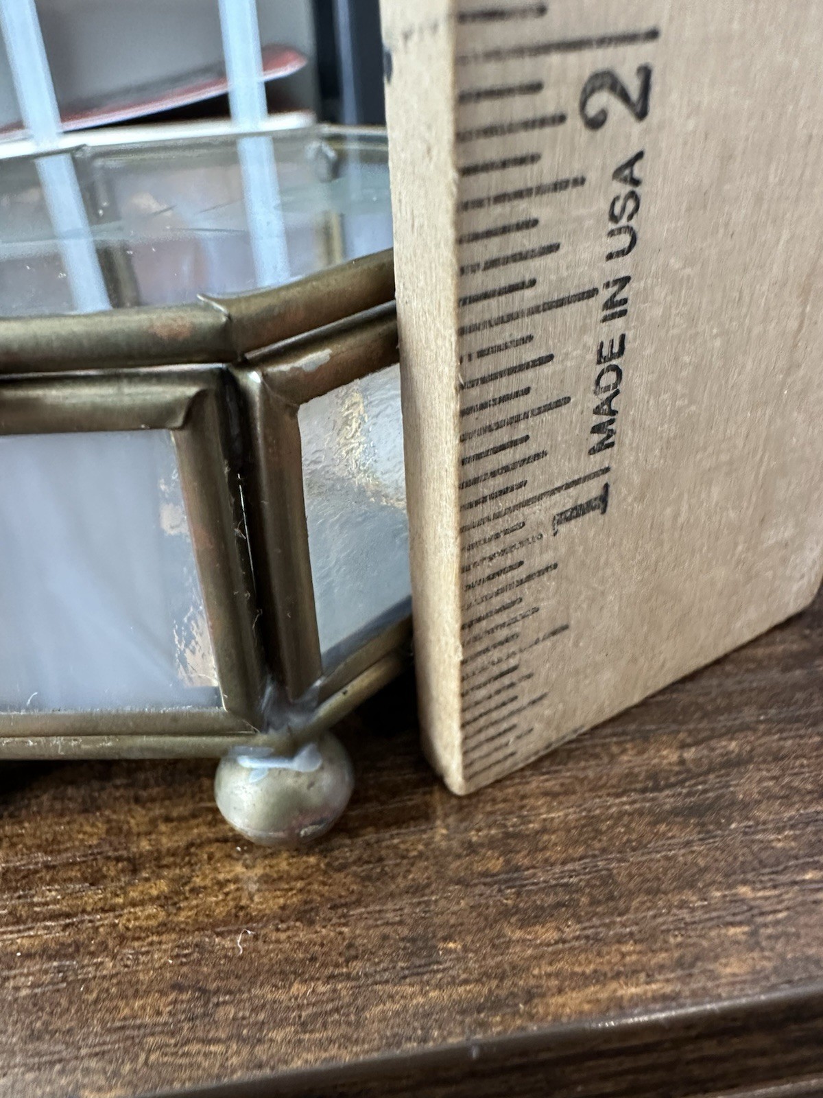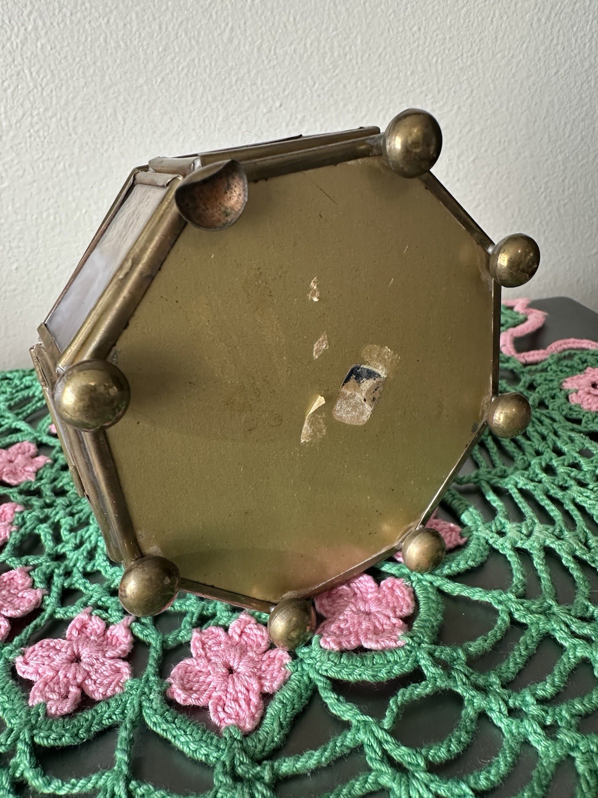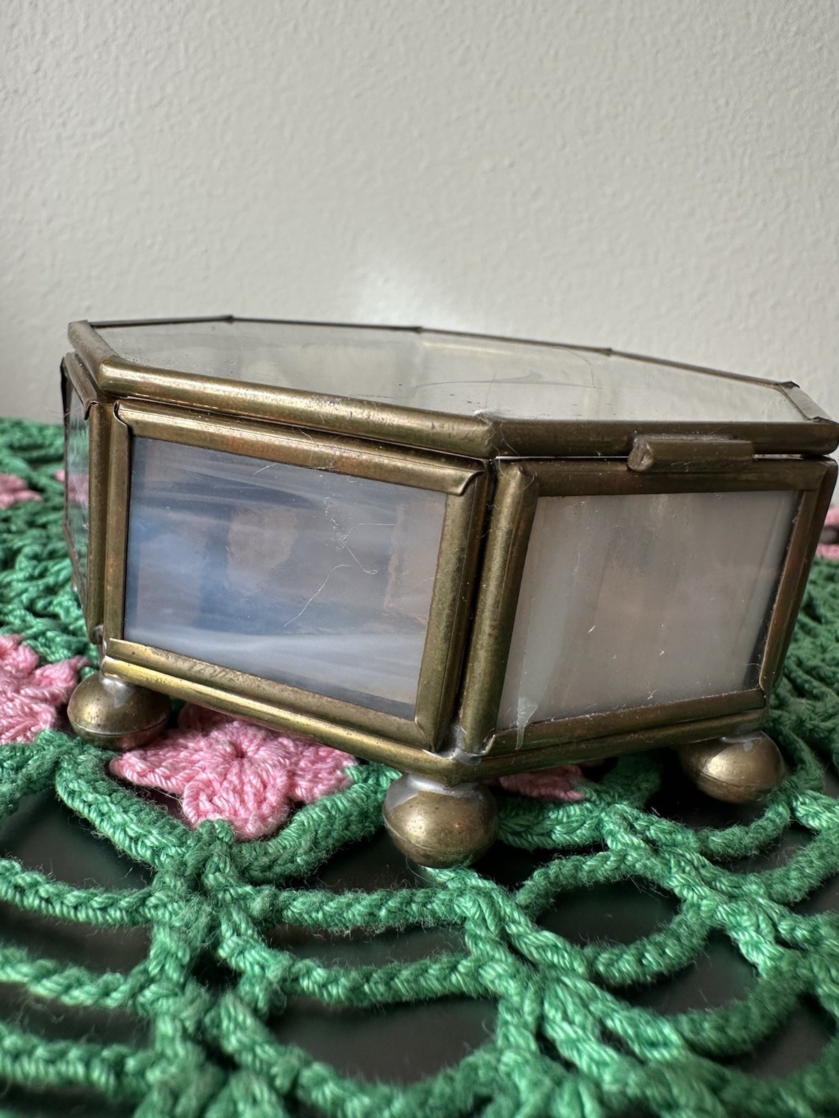 как выглядит Vintage Glass Brass Mirror Bottom Floral Etched Octagon Trinket Jewelry Box фото