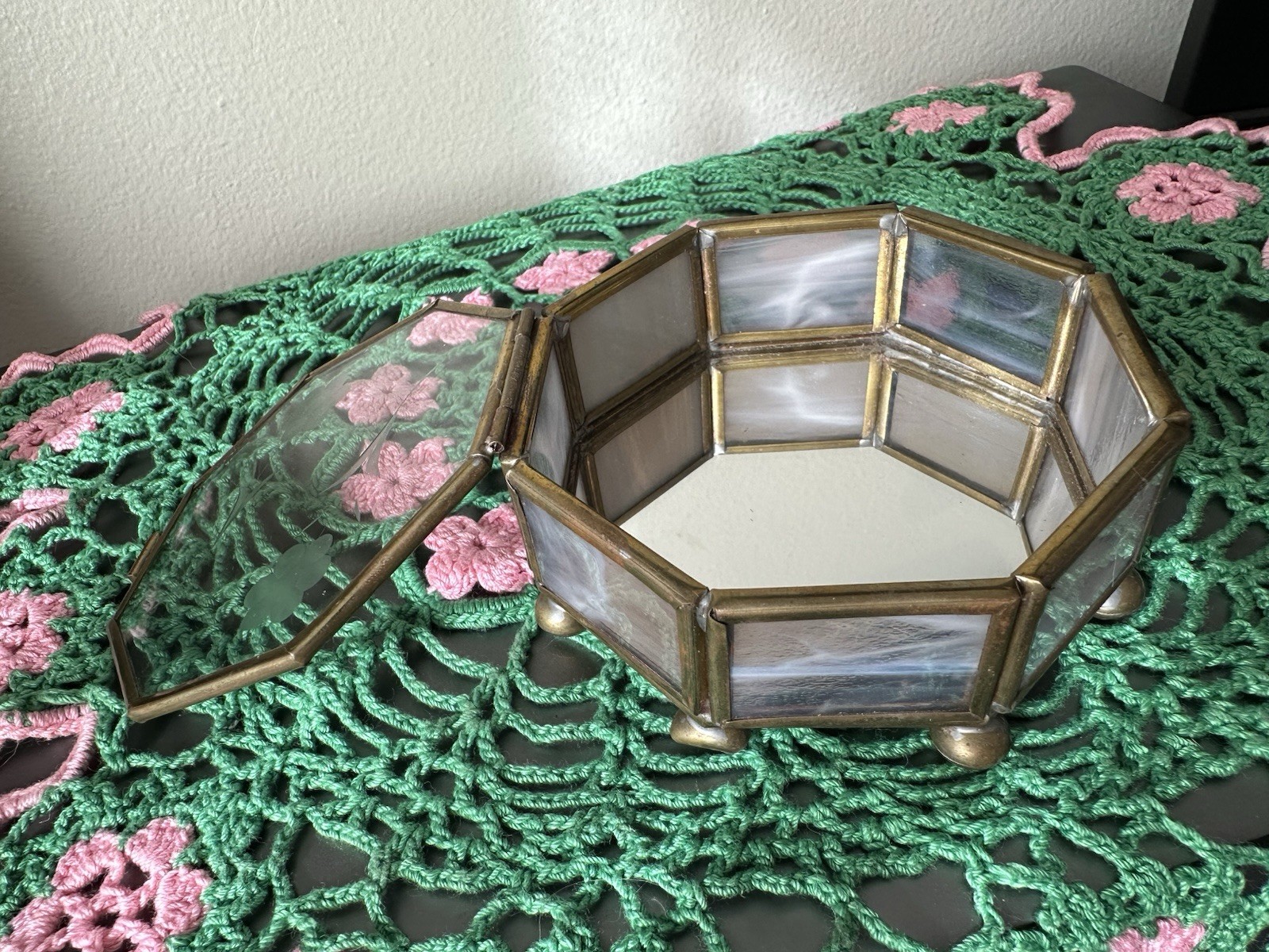 Vintage Glass Brass Mirror Bottom Floral Etched Octagon Trinket Jewelry Box