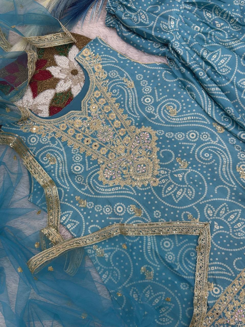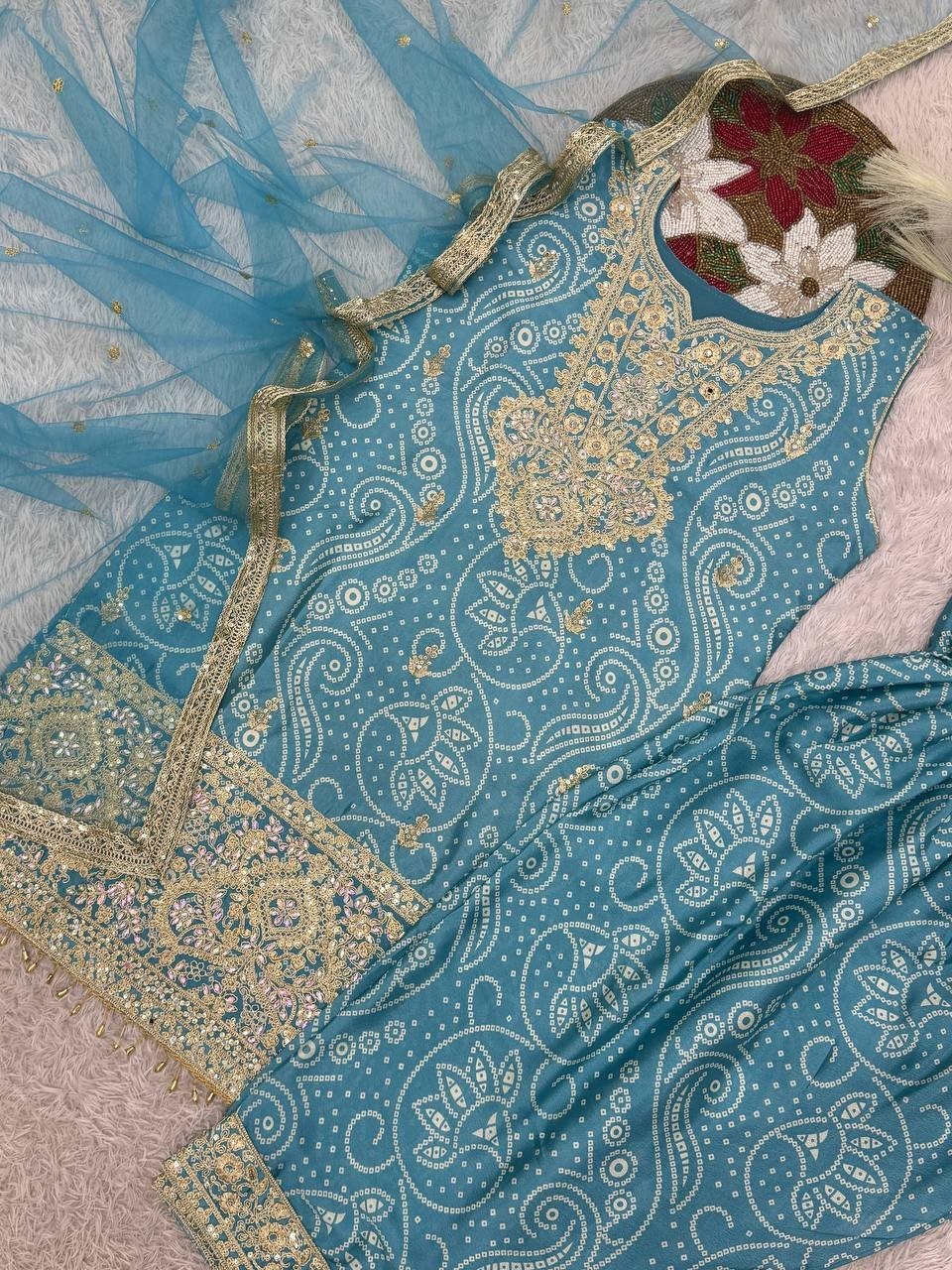 как выглядит Designer Pure Chinon Silk Sky Blue Top Dhoti With Dupatta For Functional Wear фото