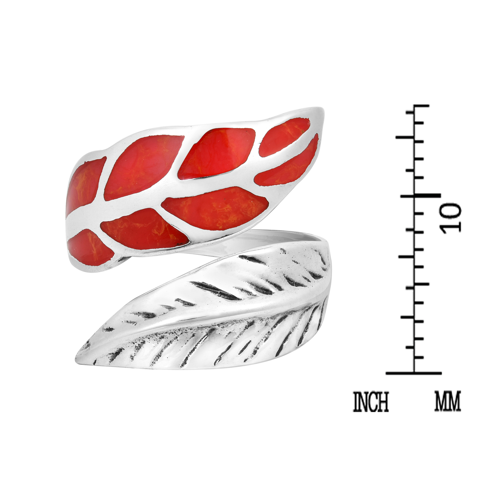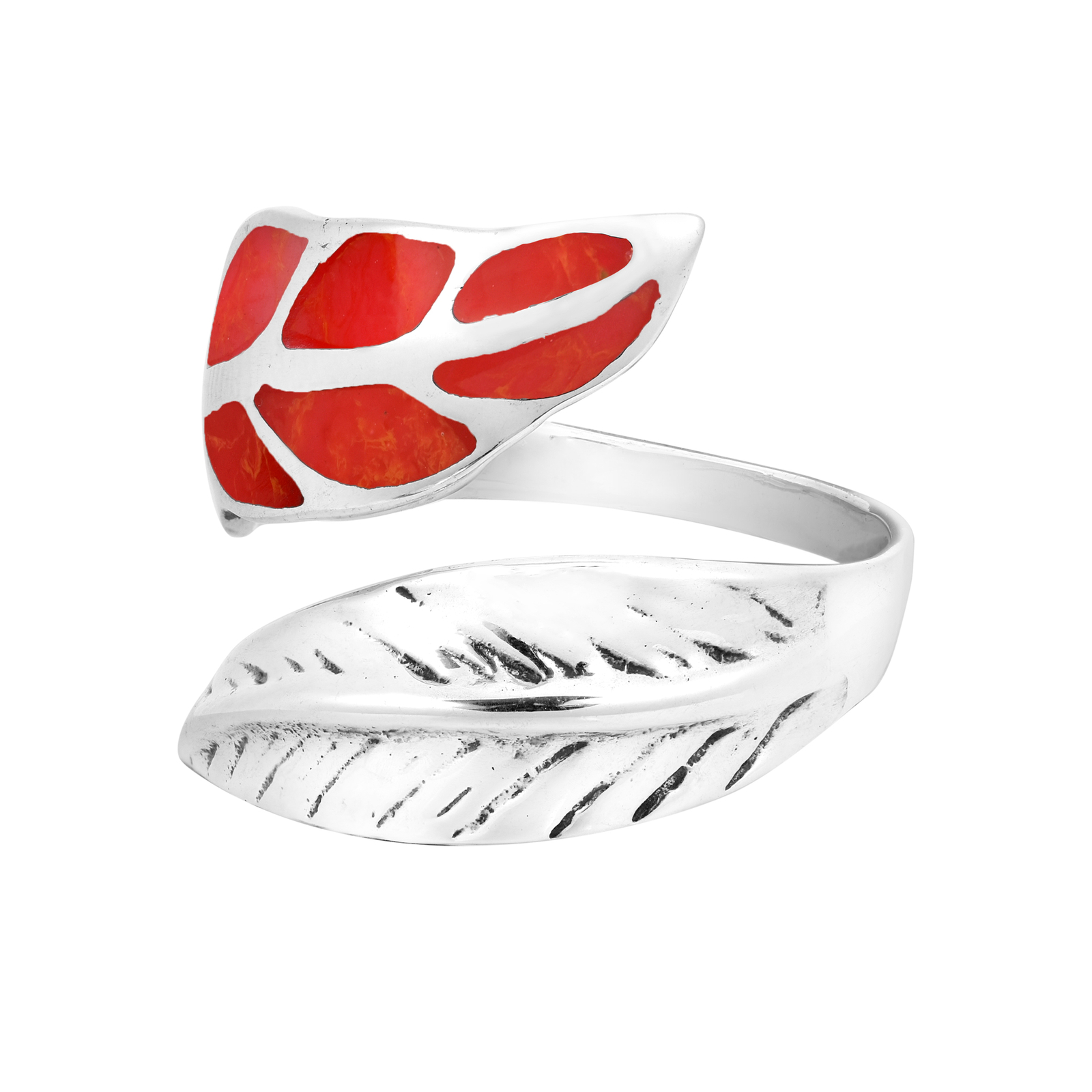 Loving Nature Red Synthetic Coral Leaf Wrap Sterling Silver Ring