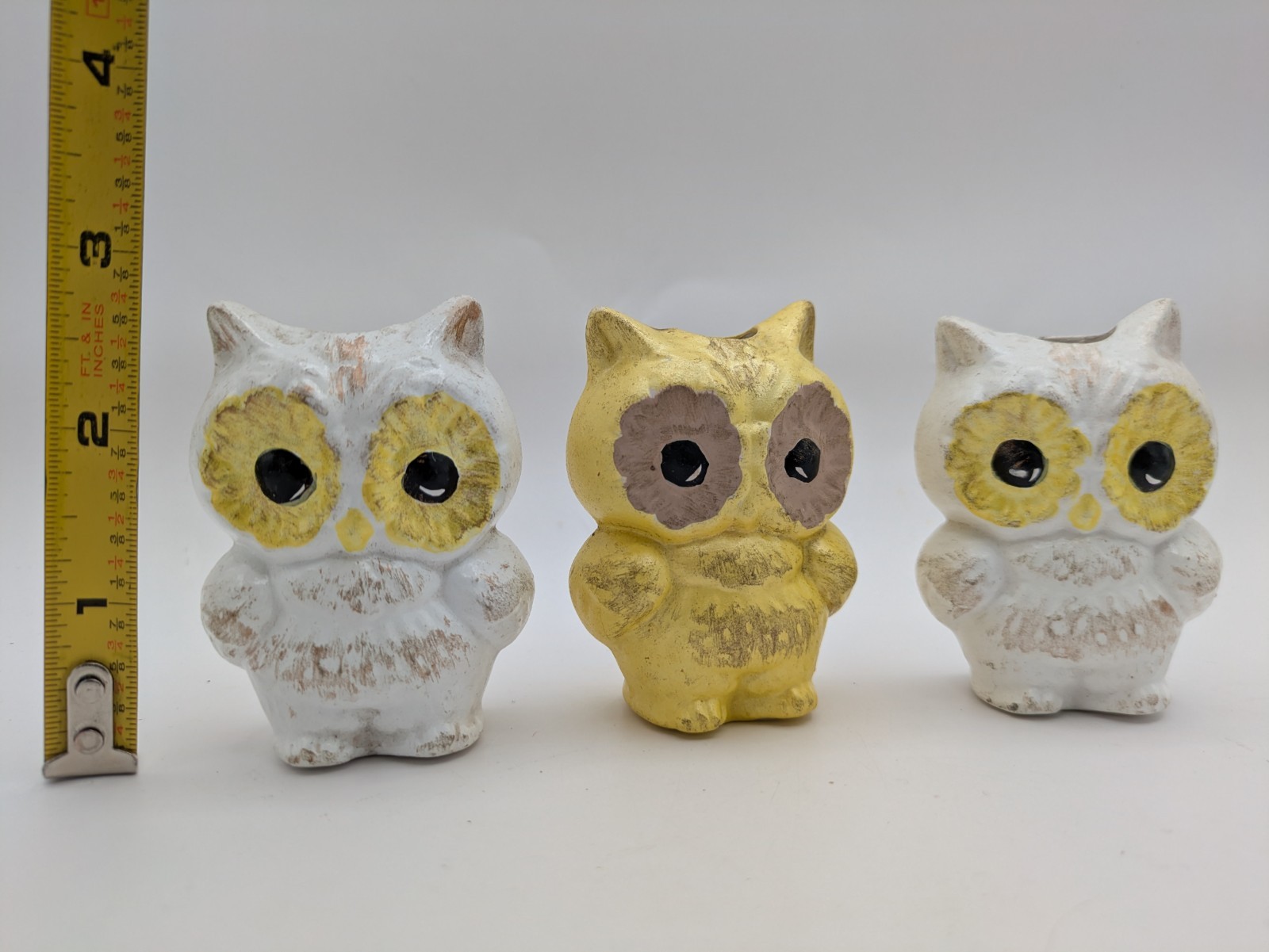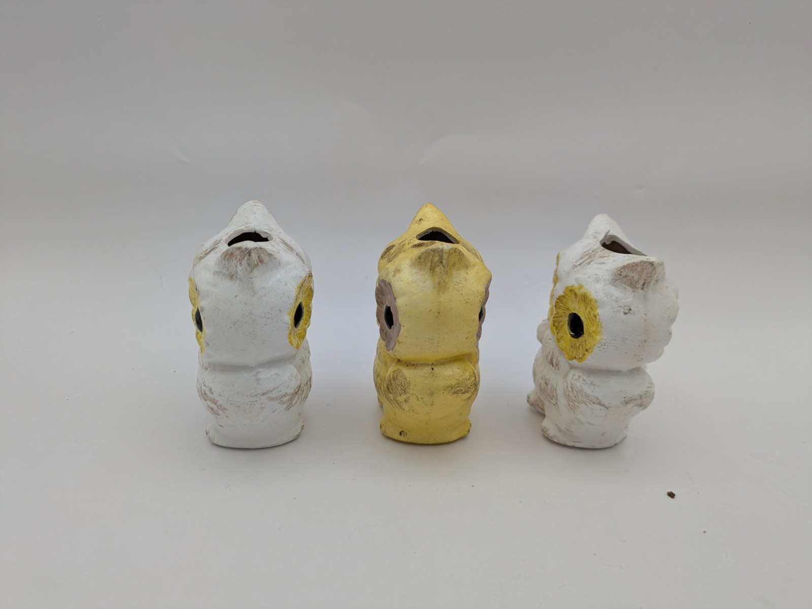 3 Vintage Ceramic Macrame Beads, Owls White, Yellow, Gold