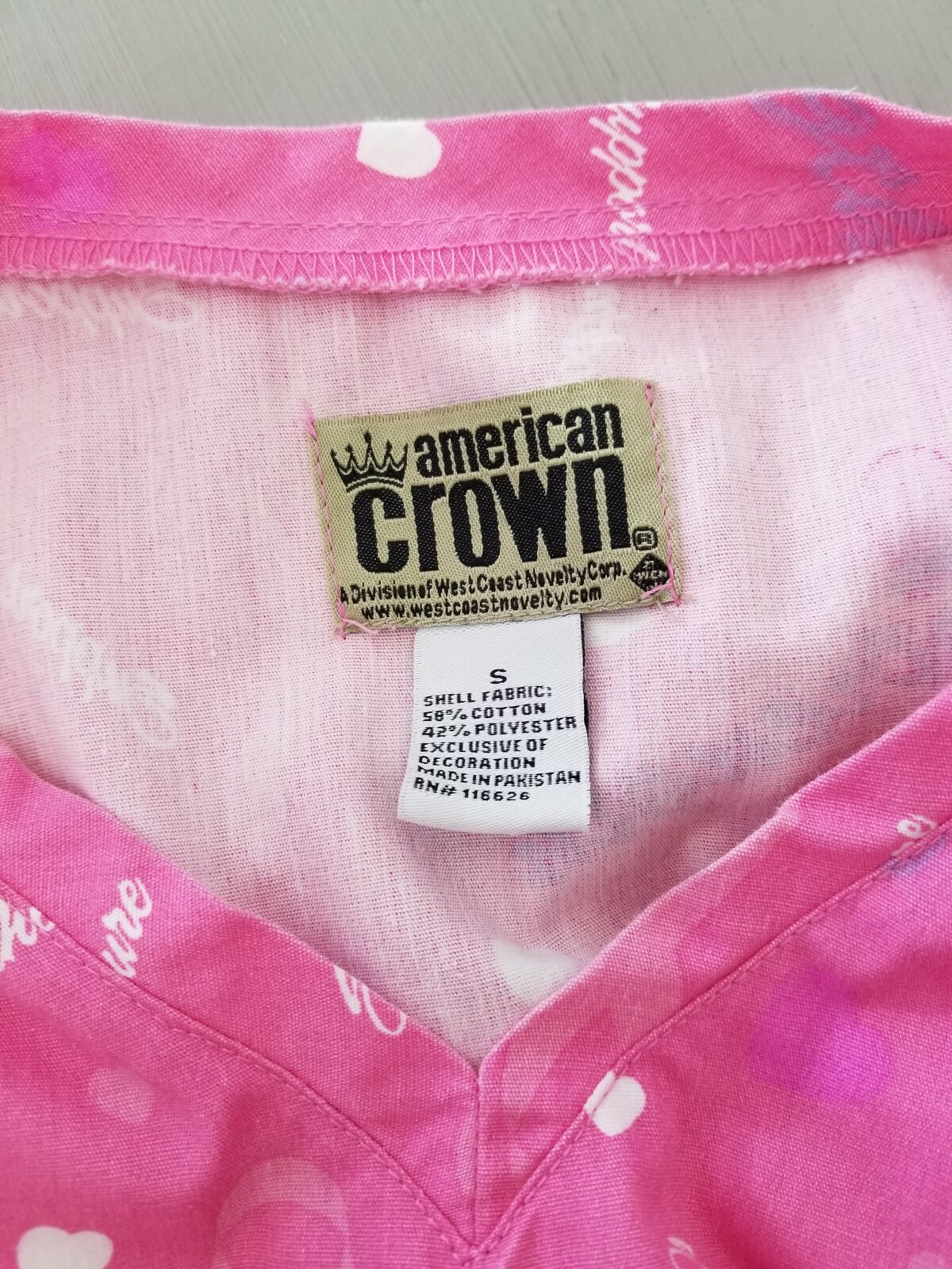 American Crown Scrub Top Size Small PINK RIBBON HEARTS CURE CANCER Nurse Medical