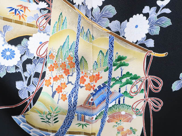 • Vintage Japanese Kimono Silk Black Tomesode Silk Embroidery Five Crests EB-351
