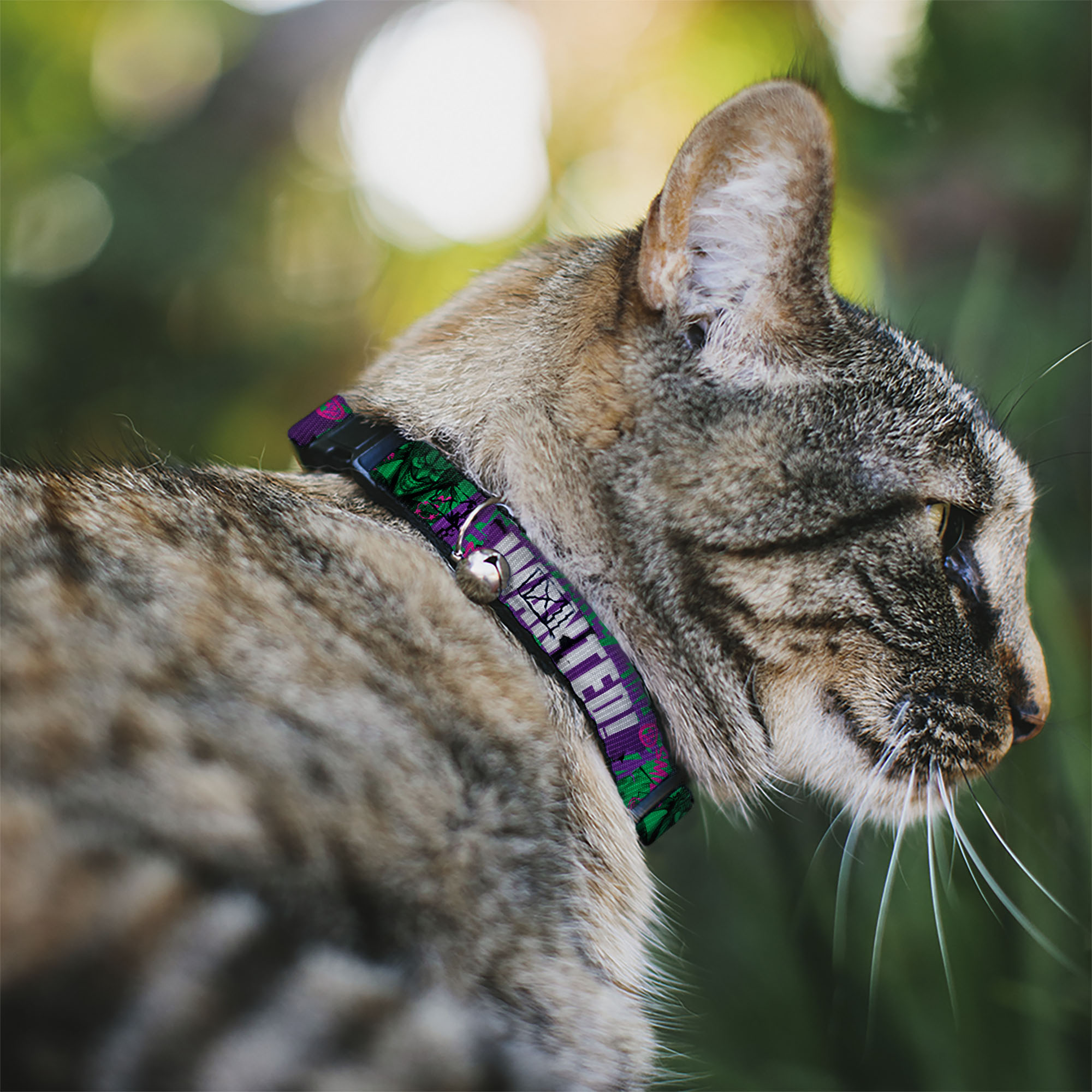 Cat Collar Breakaway with Bell THE JOKER WANTED Smiling Pose and Graffiti Purple
