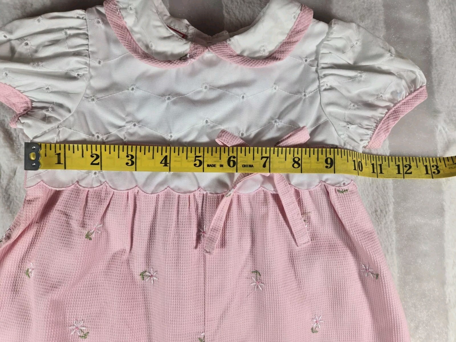 Vintage White Eyelet Pink Ribbon Embroidered Girls Romper Baby Togs 3-6 months