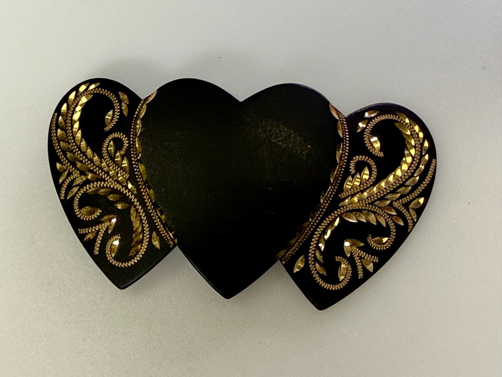 как выглядит Triple Heart Shaped Swirl Ornate Etched Black Gold Color Belt Buckle Signed LVK фото