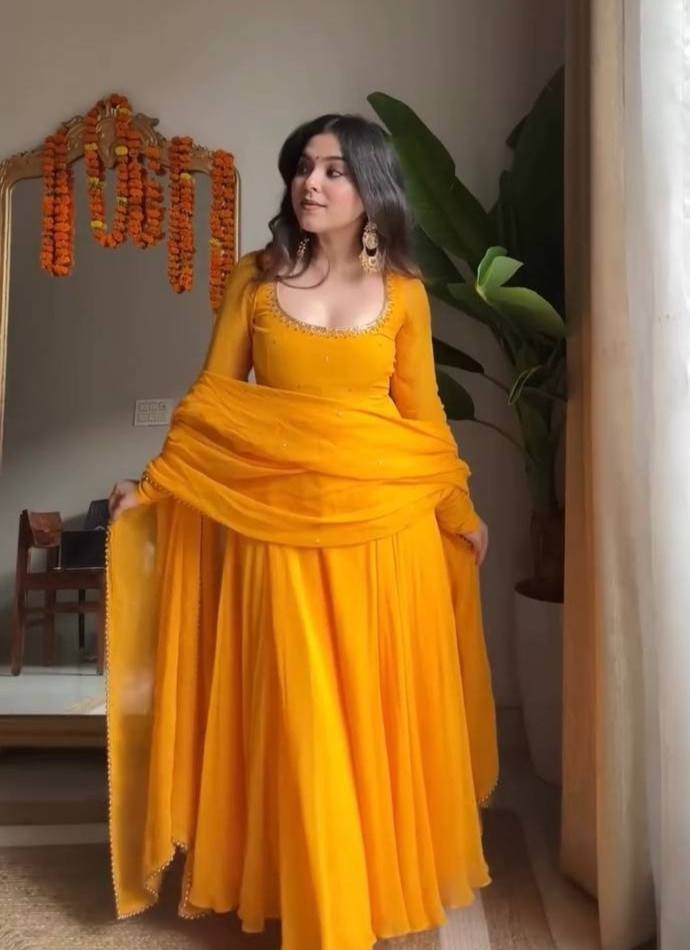 Anarkali Gown Suit Faux Georgette Handwork Moti Lace Readymade 3-Piece Set