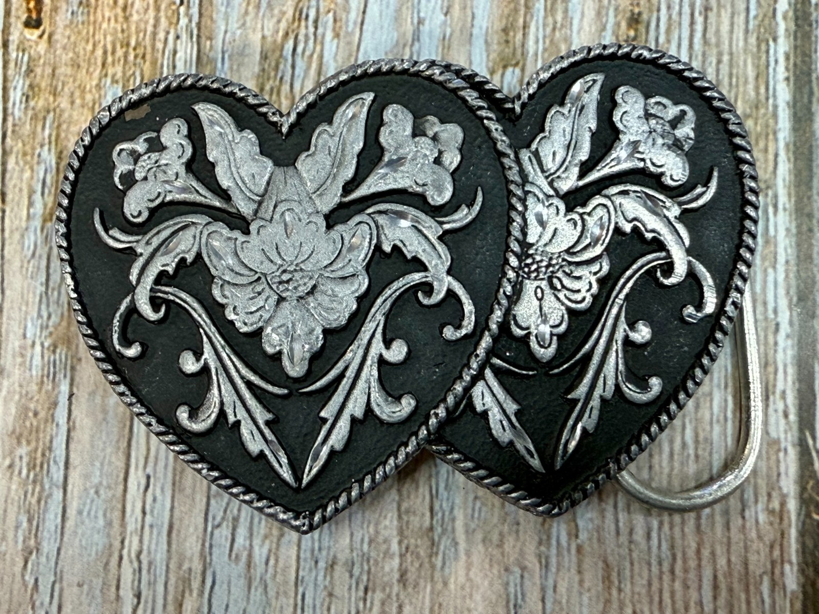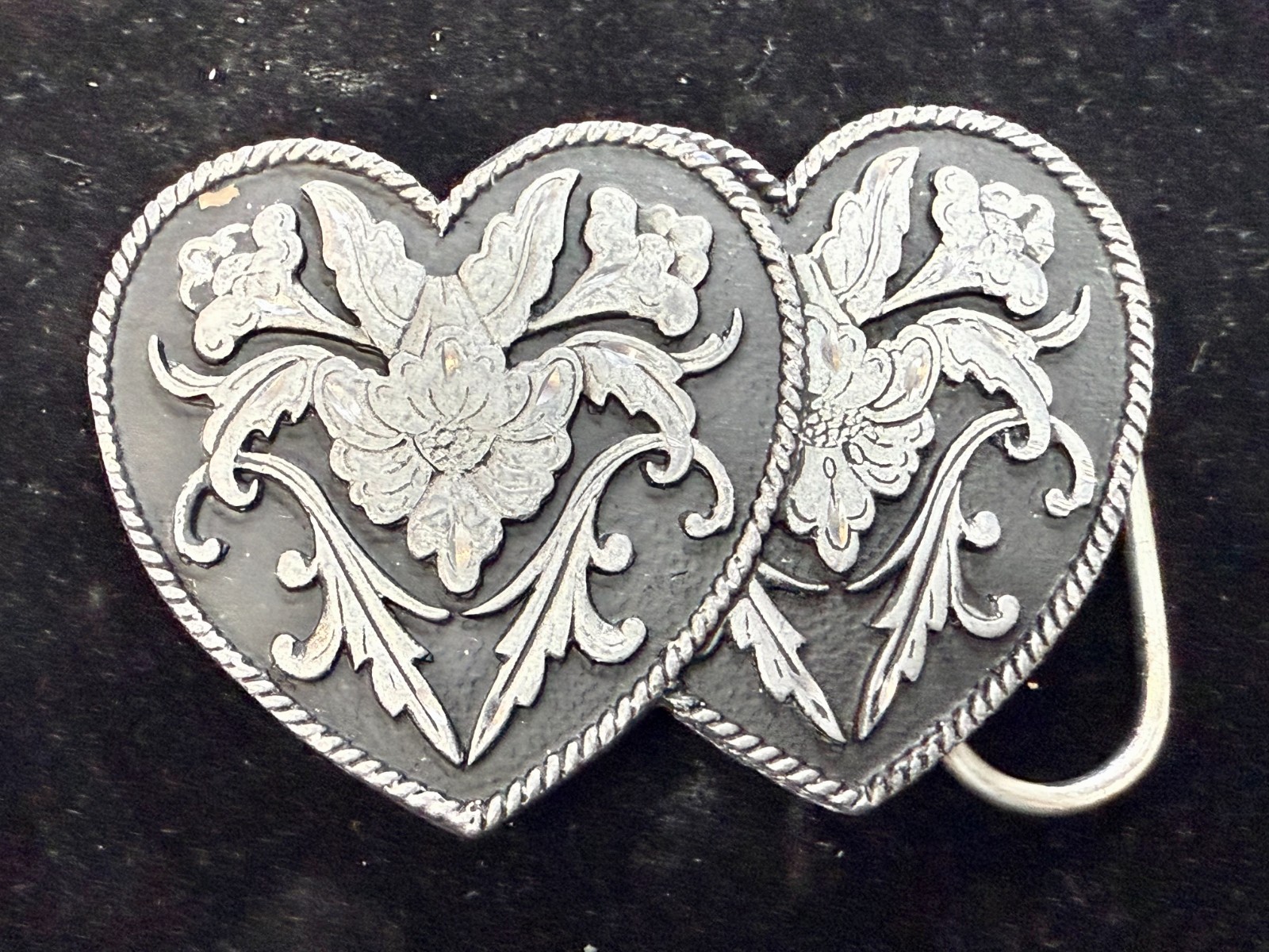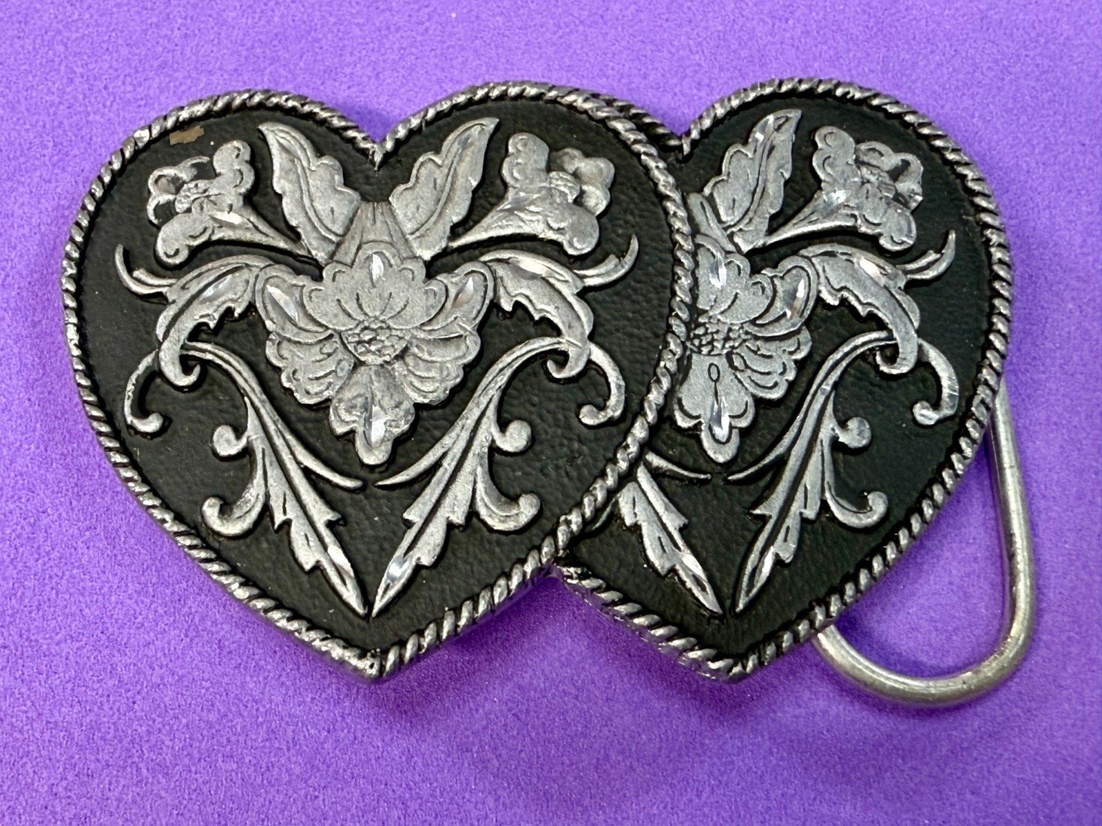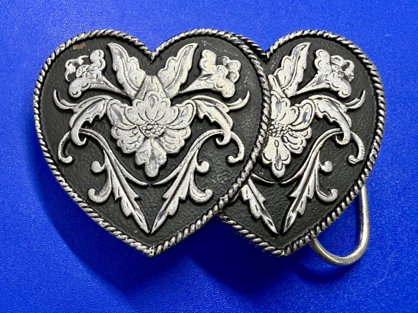 Two Dual Hearts Vintage Western Floral Themed Cutout Belt Buckle By Siskiyou