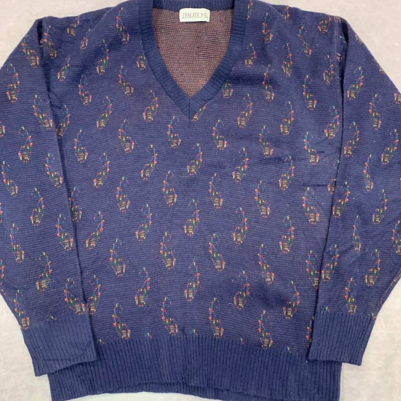 Vintage Knitted Jumper abstract patterned v-neck grandad knit sweater Men's L