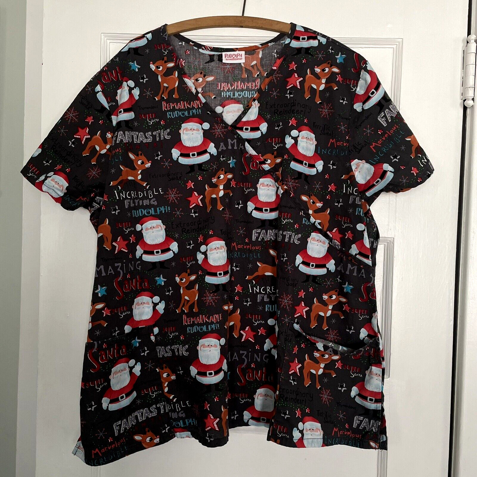 Scrub Top Rudolph Red Nosed Reindeer Santa Claus Christmas Black No Size
