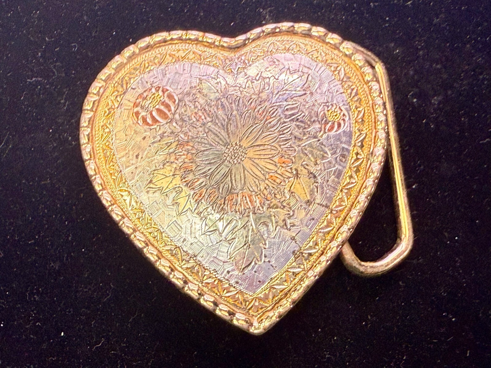 • HEART Flowers Vintage Mixed Metal Cutout Belt Buckle Marked W USA