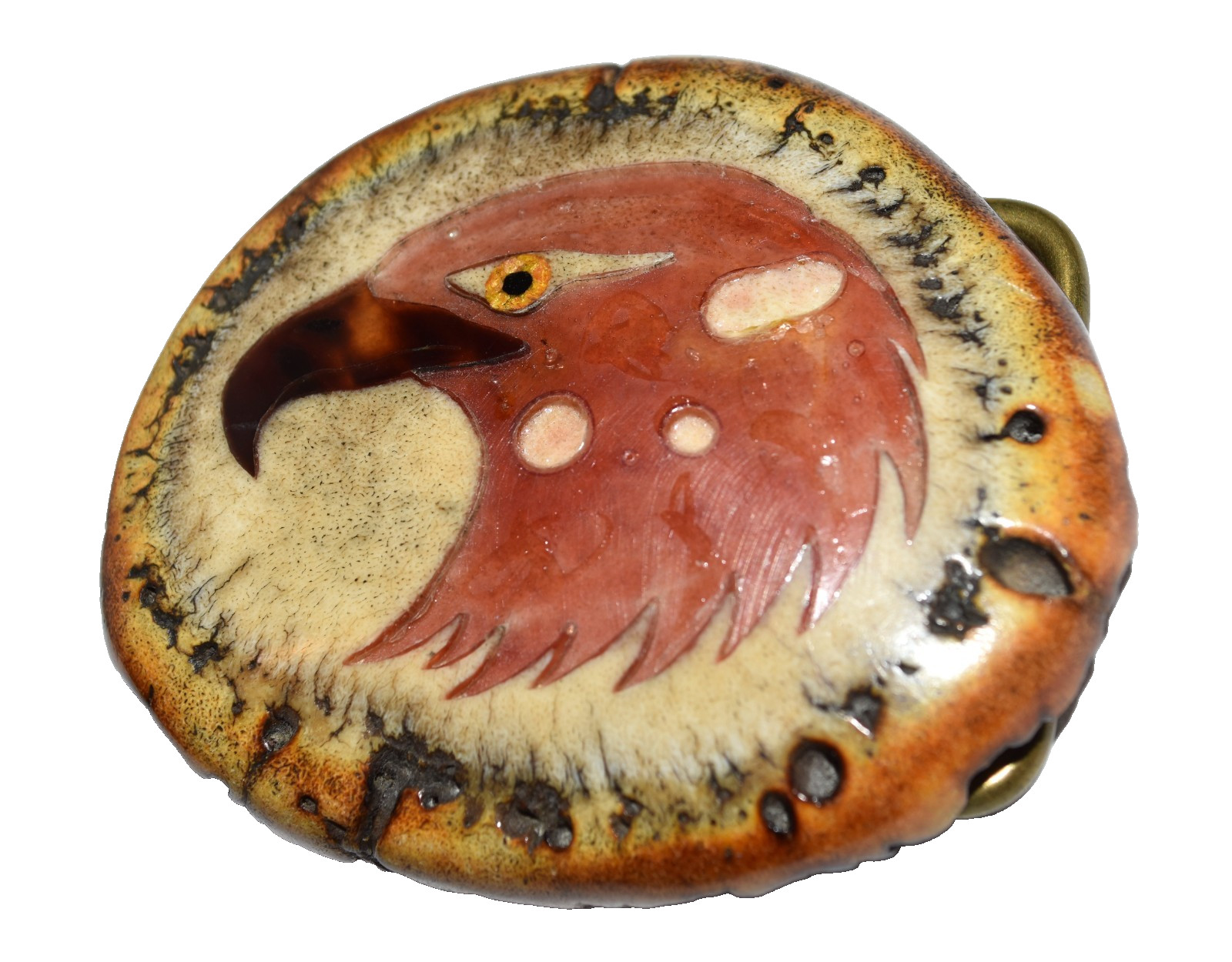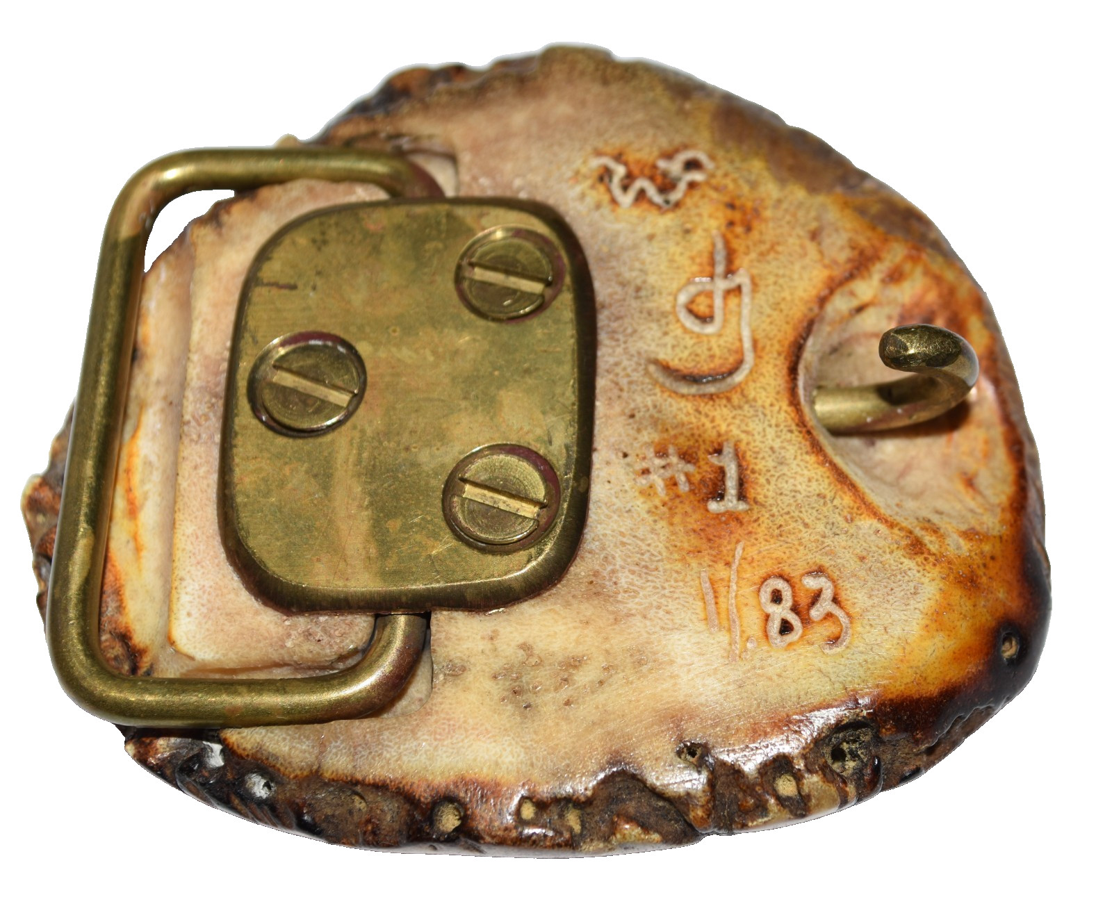Vtg 1983 Signed Western Elk Antler Burr Hand Craved Shell Eagle Head Belt Buckle