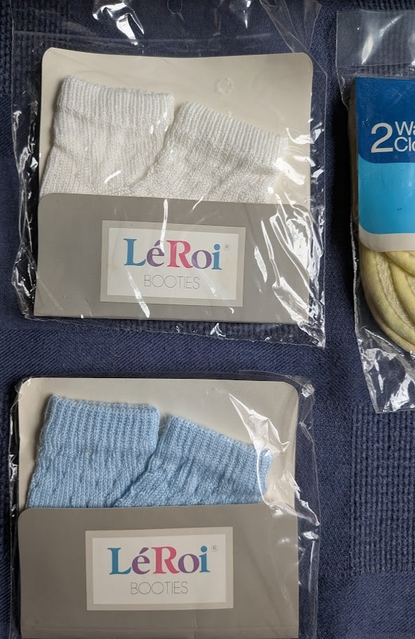 как выглядит Lot Vintage Baby Items New in Packages Socks Utensils Safety Sitter Bibs Cloths фото
