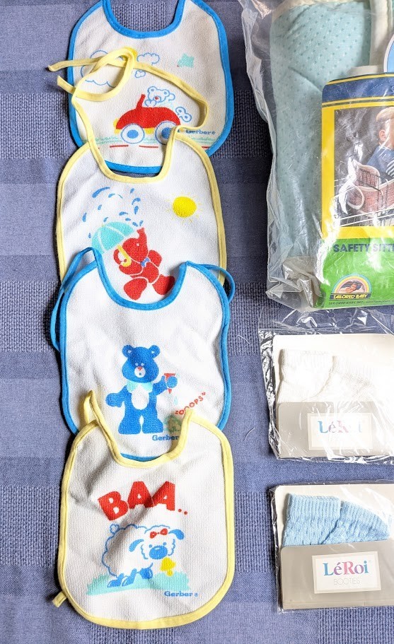 Lot Vintage Baby Items New in Packages Socks Utensils Safety Sitter Bibs Cloths