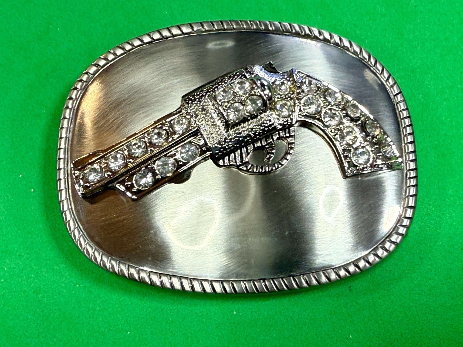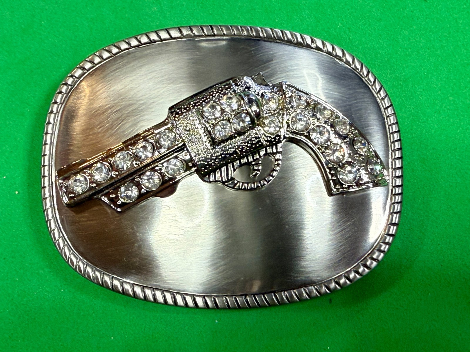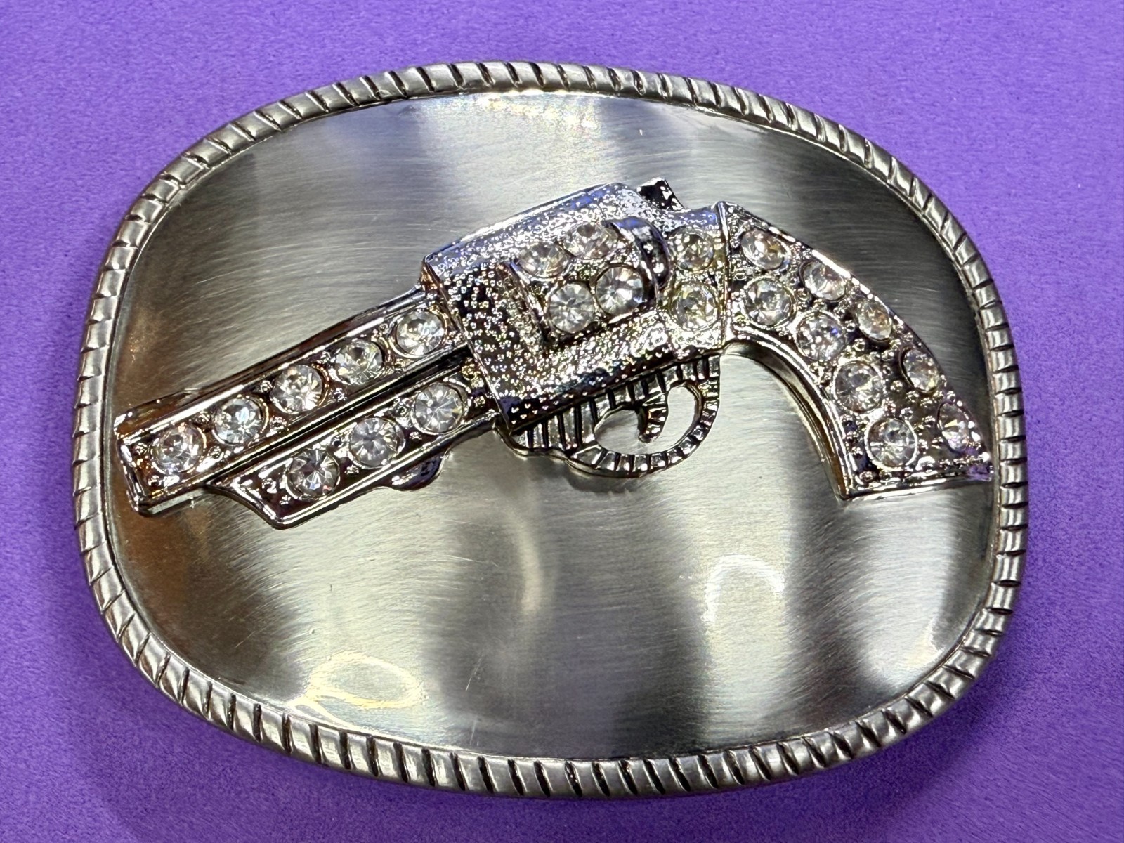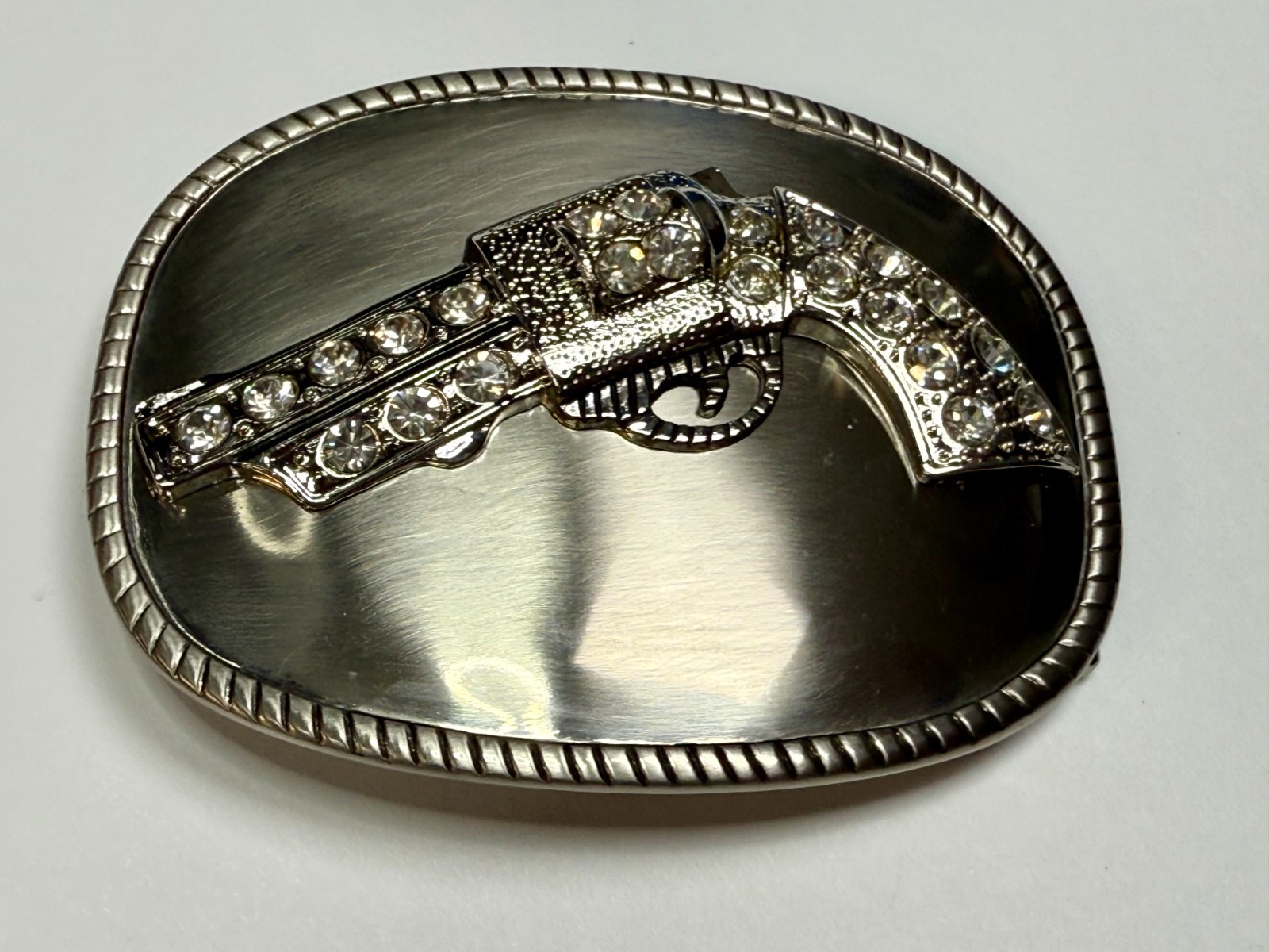 как выглядит Jeweled Gun Pistol Revolver Rhinestone Accented Silver Color Oval Belt Buckle фото
