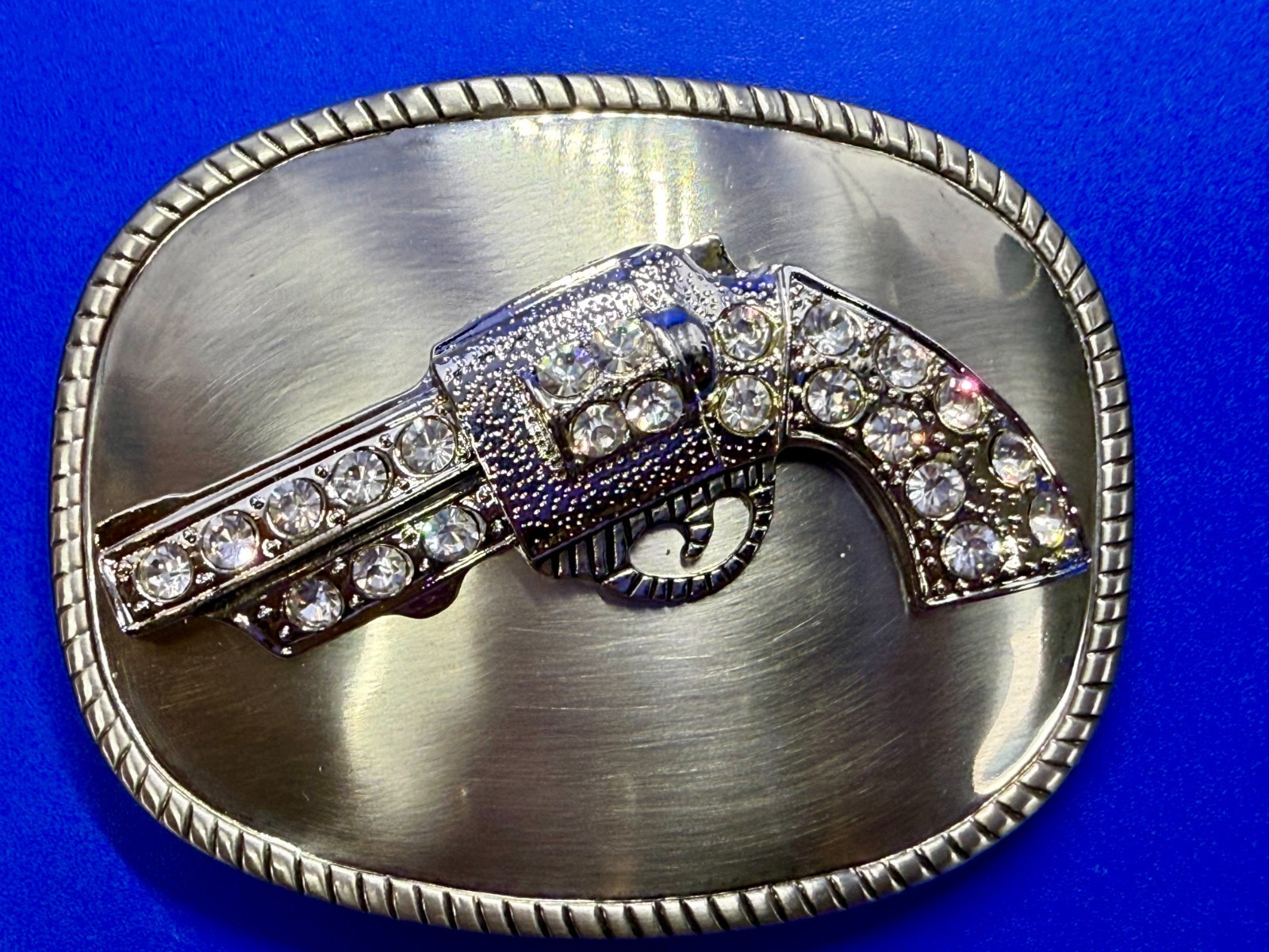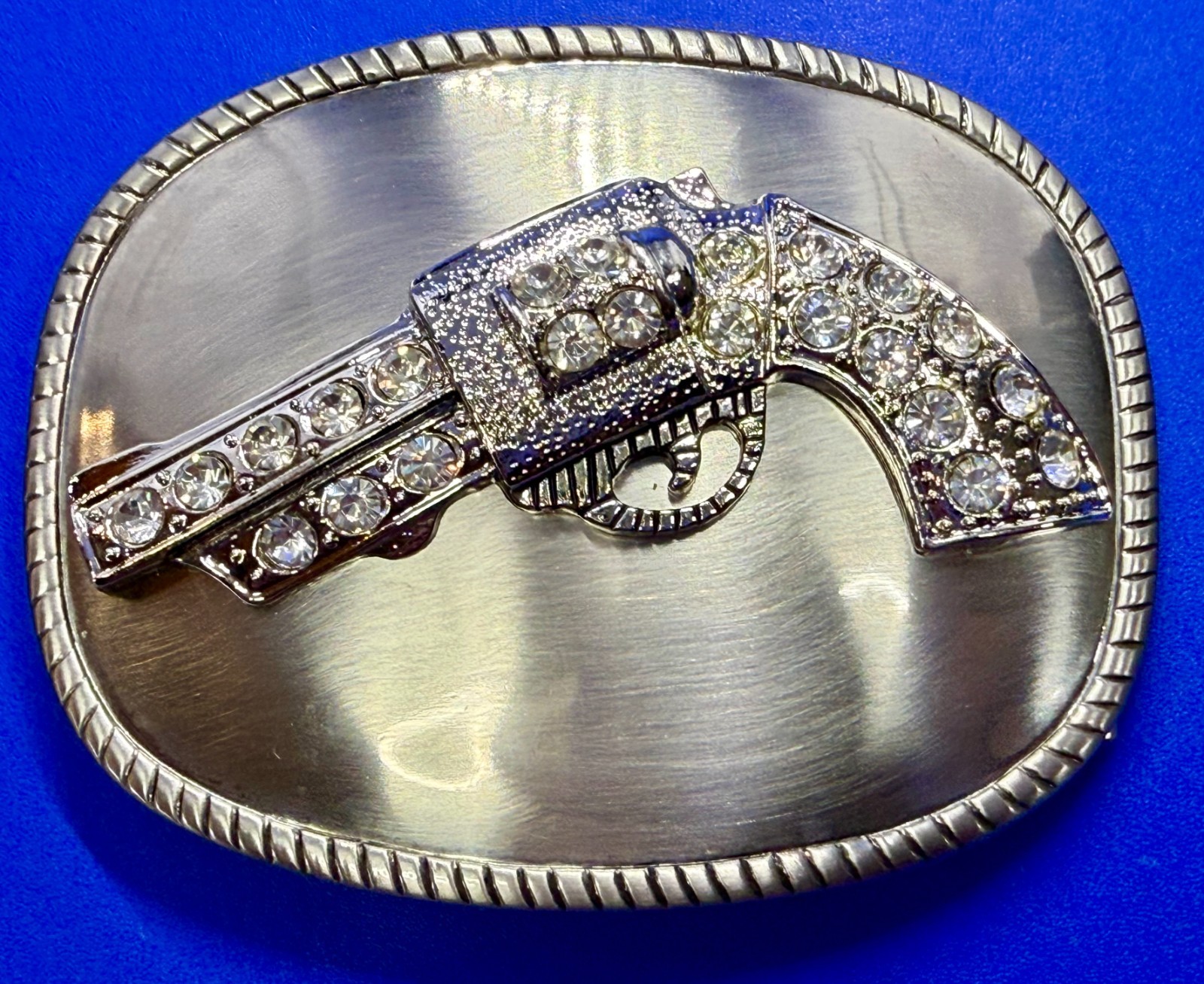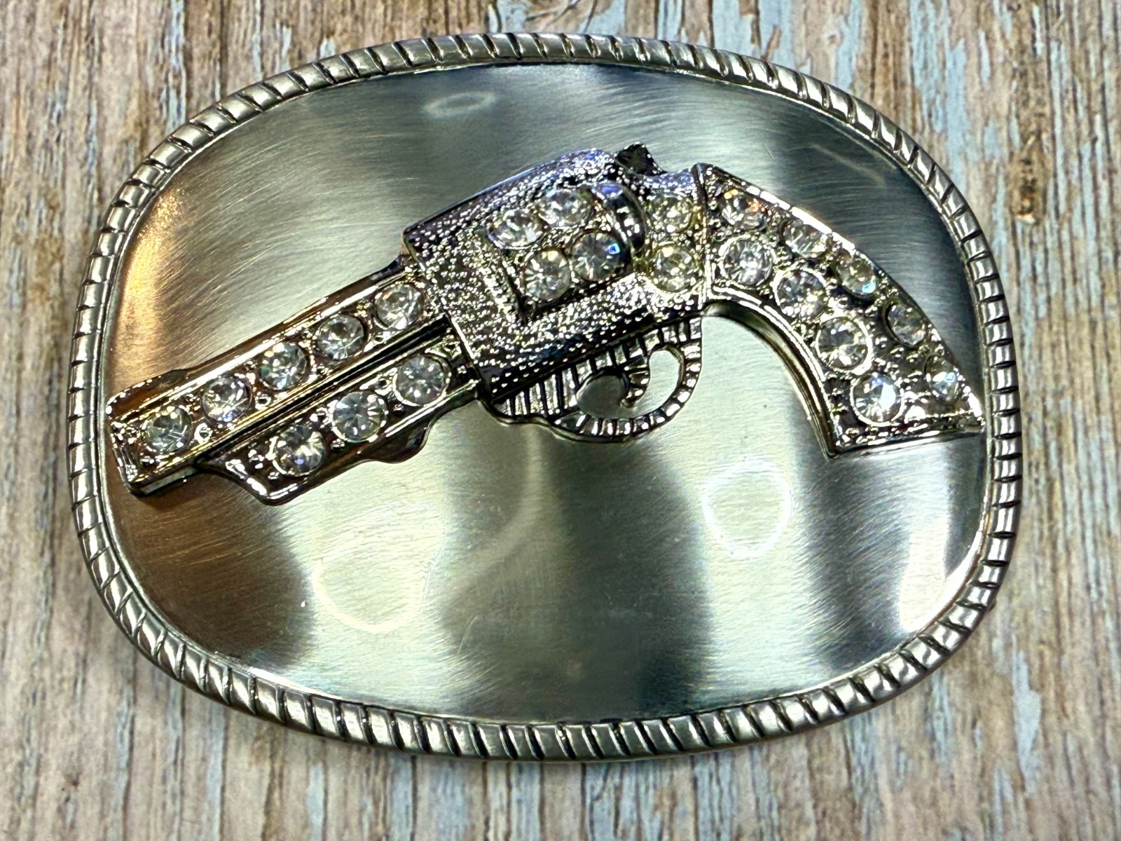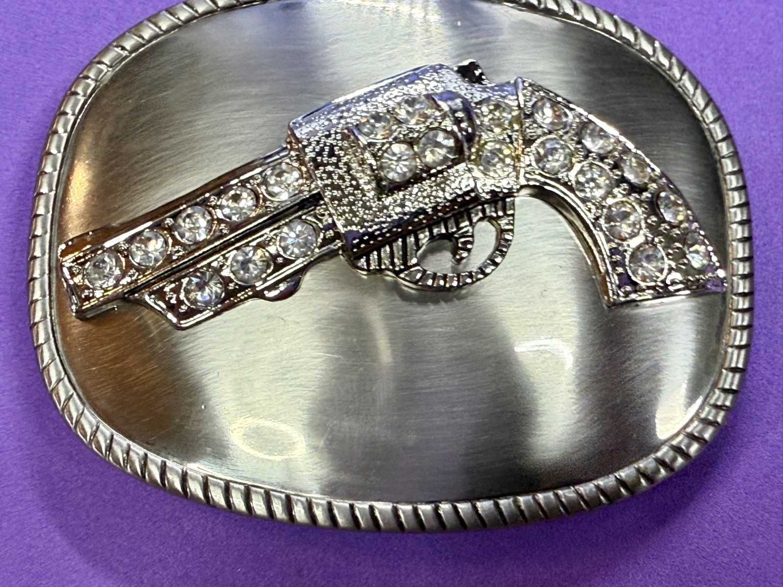 как выглядит Jeweled Gun Pistol Revolver Rhinestone Accented Silver Color Oval Belt Buckle фото