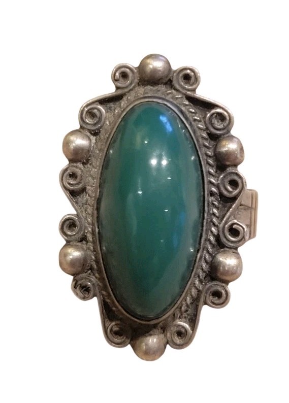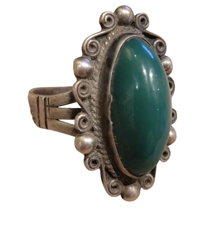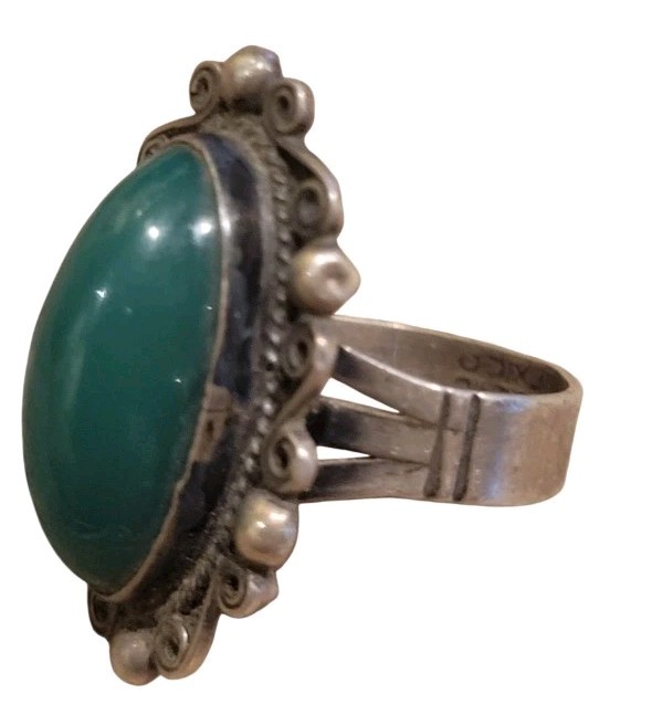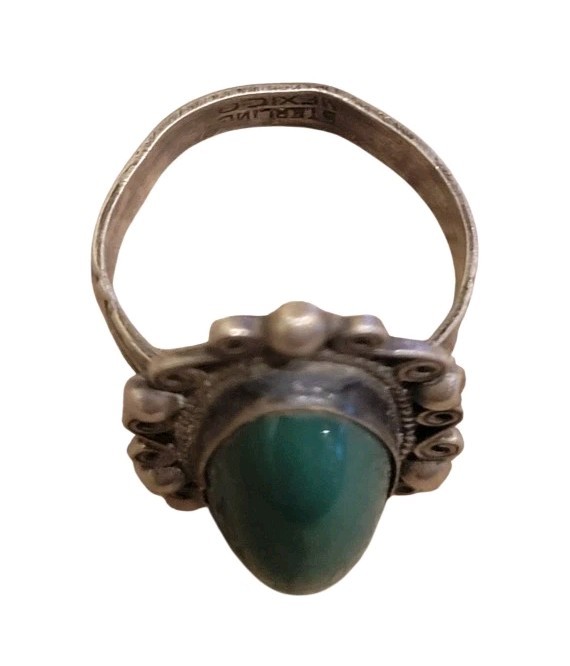 как выглядит Vintage Sterling Silver Mexico Dark Green Jade Stone Ring Sz 6.5 Signed фото
