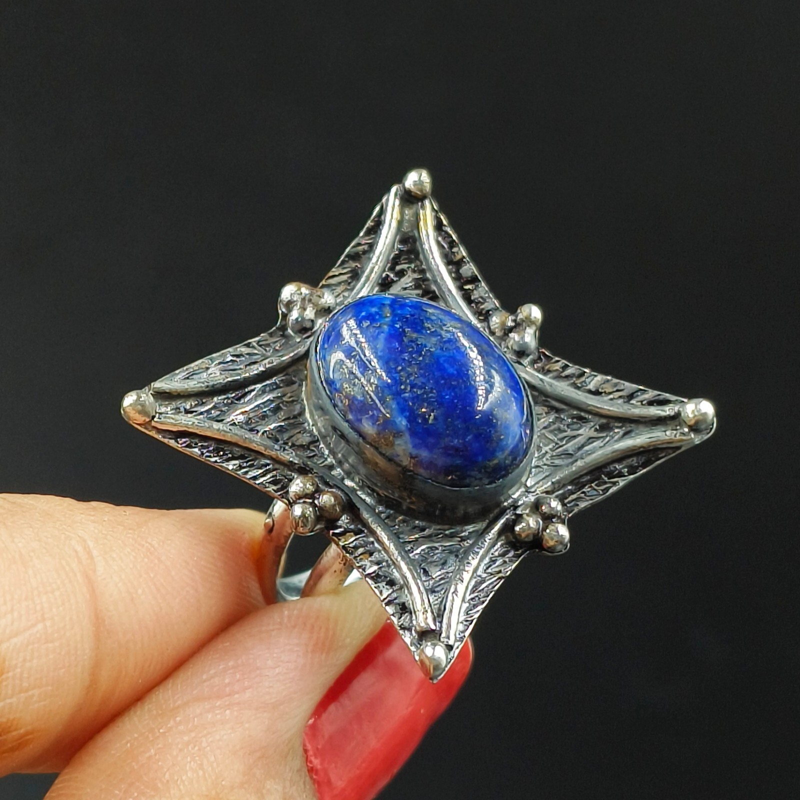 как выглядит Natural Lapis Lazuli Oval Gemstone 925 Sterling Silver Ring Size-8 US фото