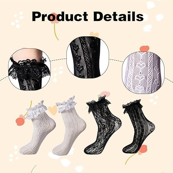 как выглядит 4 Pairs lace ruffle socks Lace Socks for Women Ankle Ruffle,White Black Mesh... фото