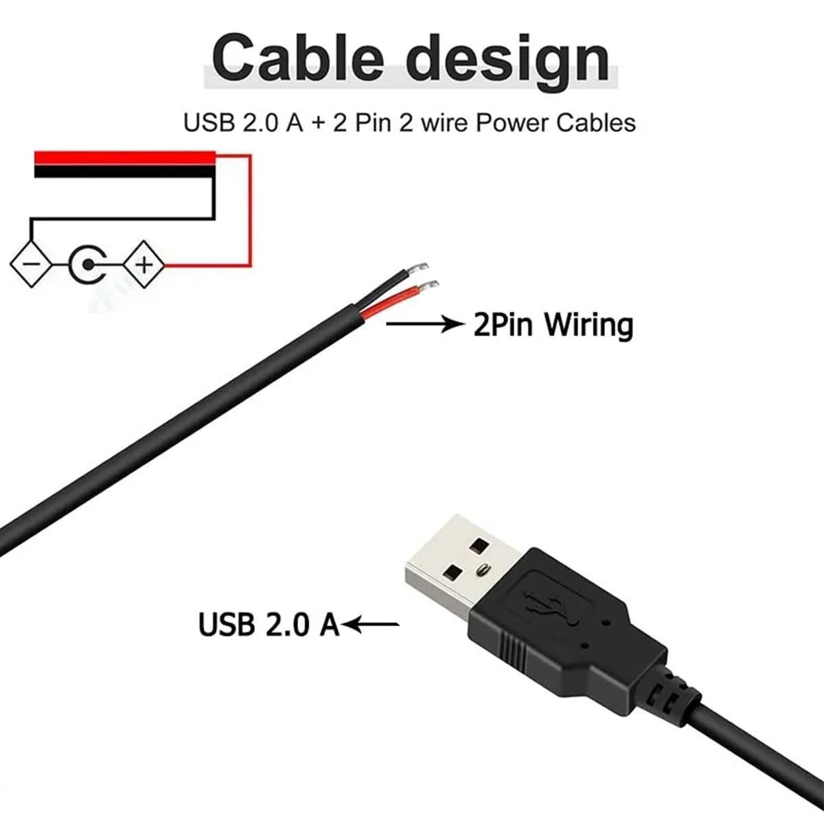 5Pcs 3.2Ft 22AWG USB 2.0 Male 2Pin Pigtail Cable, 3A 5V 3.2FT