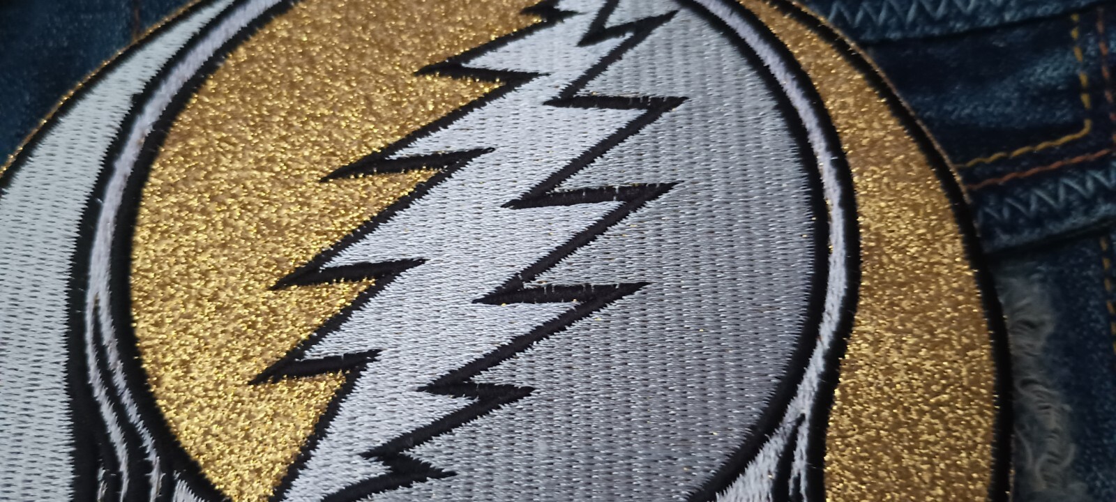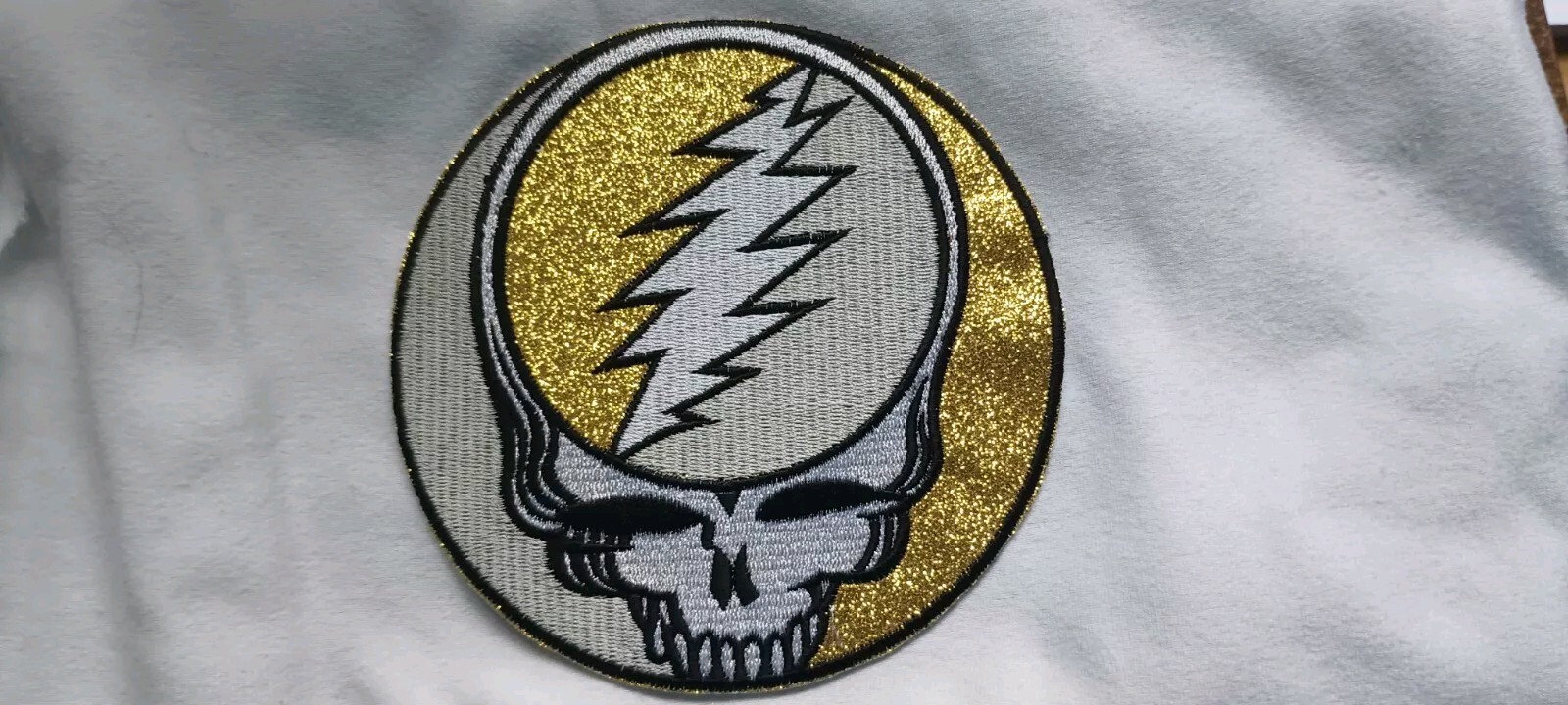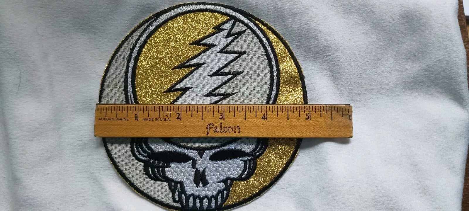 • Grateful Dead Steal Your Face Silver/ Gold Glitter 5 Inch Iron On Patch