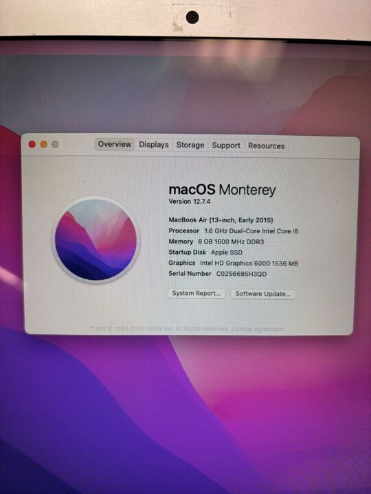 2015 Apple 13 MacBook Air Intel i5 1.6GHz 8GB RAM 128GB SSD Monterey 12.7.4