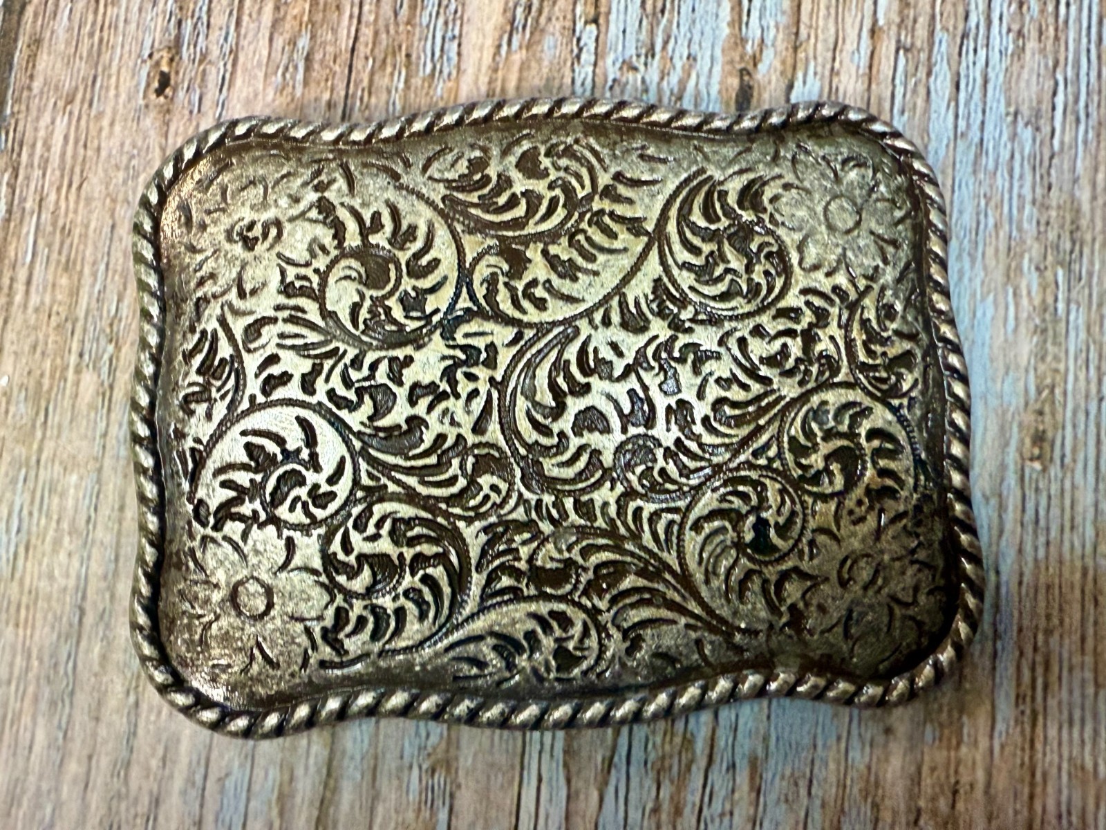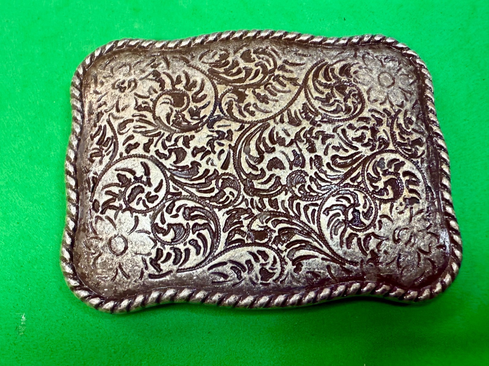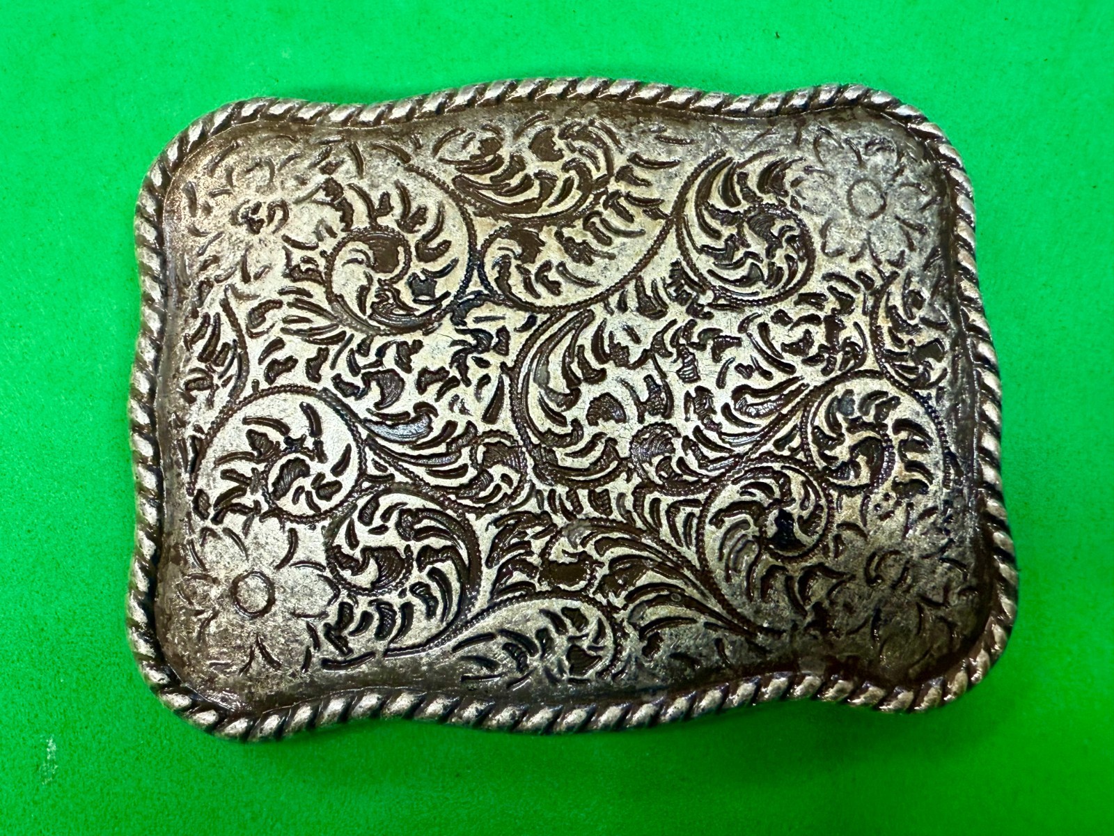 • Western Flower Swirl Design Silver Tone Belt Buckle W/ Thick Rope Boarder