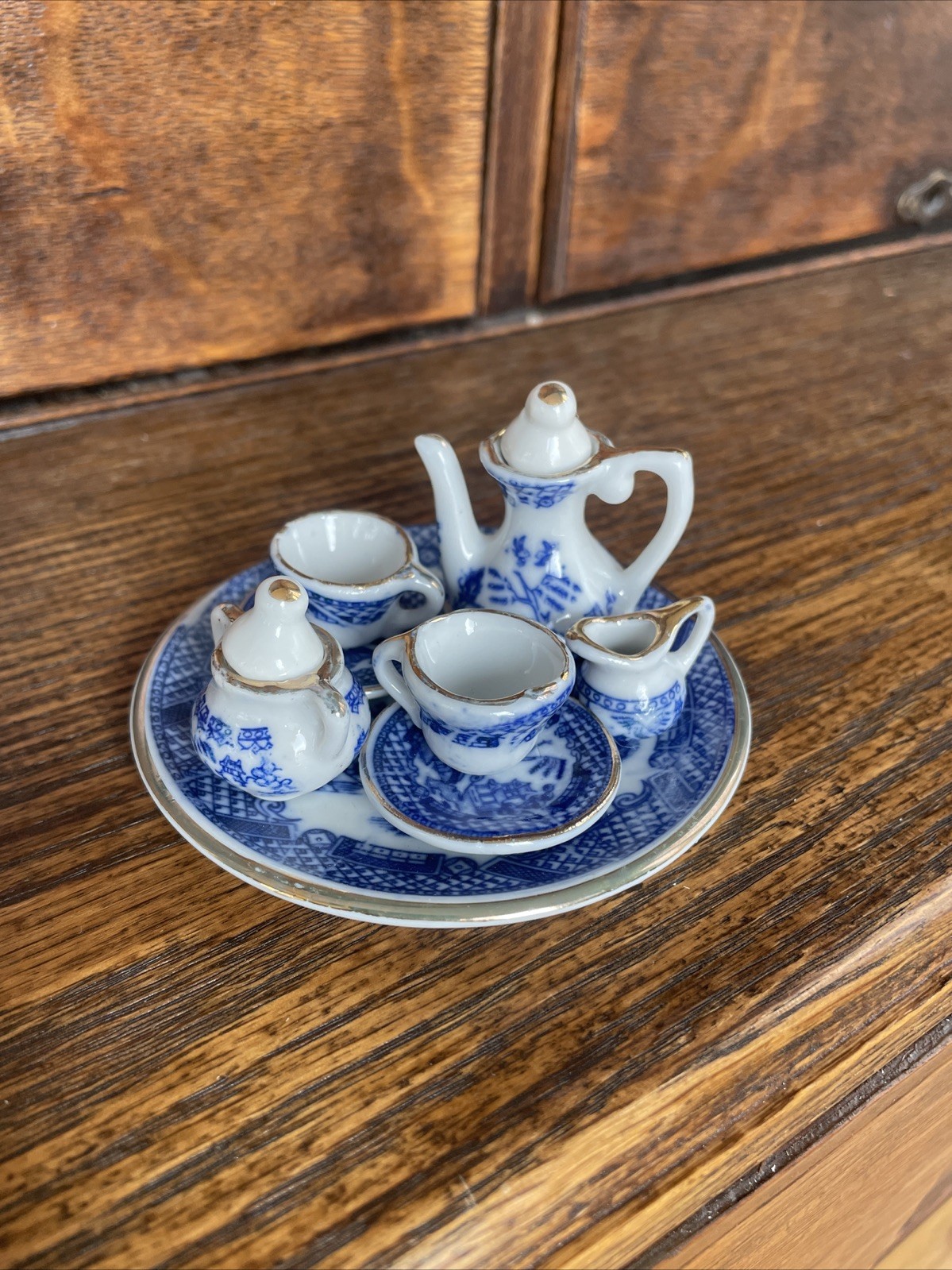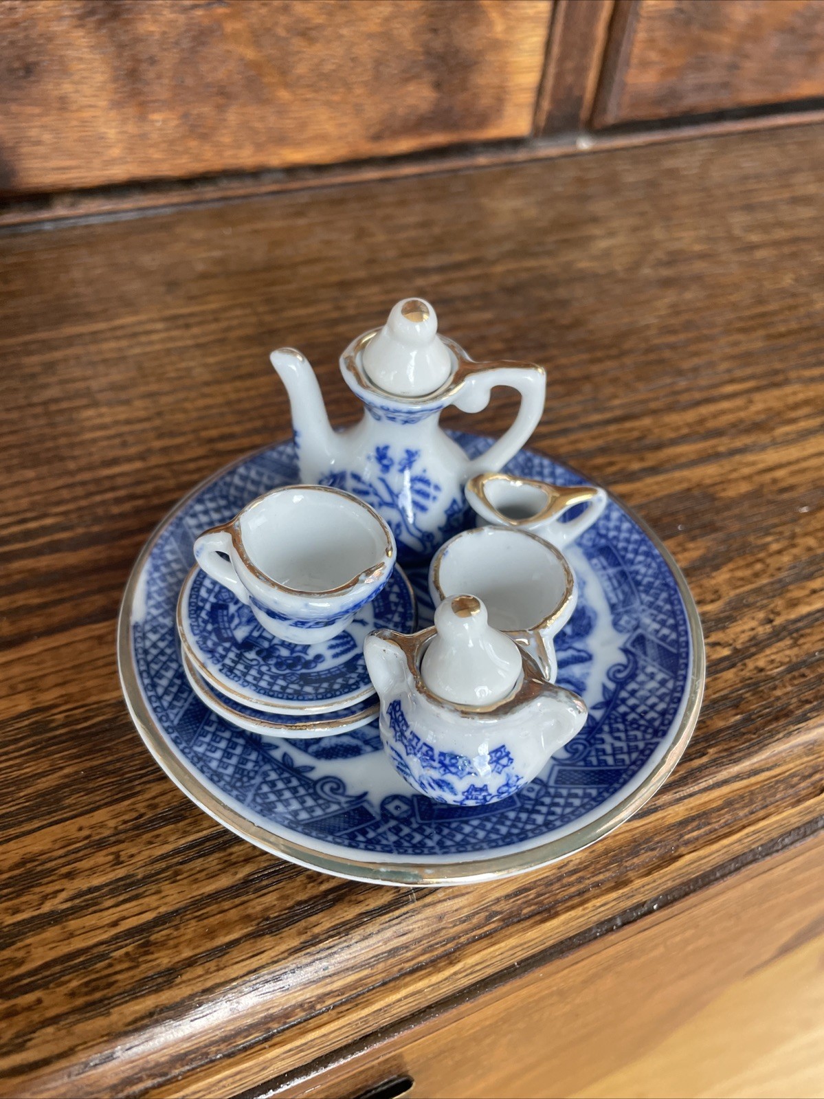 Lot of 10 Miniature Blue Willow Tea Set Pieces Cup Saucer Teapot w/Lids