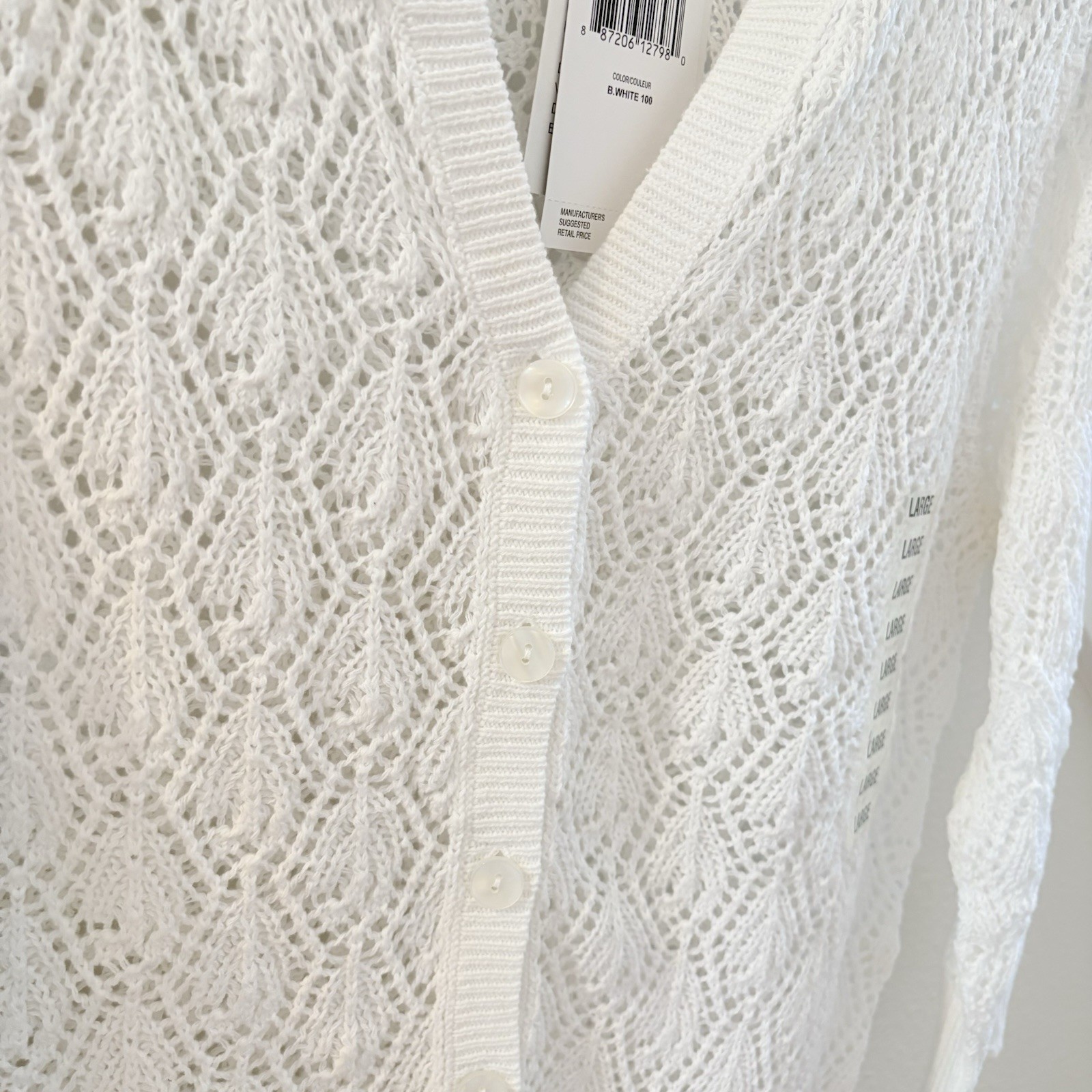как выглядит Womens Vintage Crochet Knit White Cardigan Sweater Large Cottagecore Boho Chic L фото