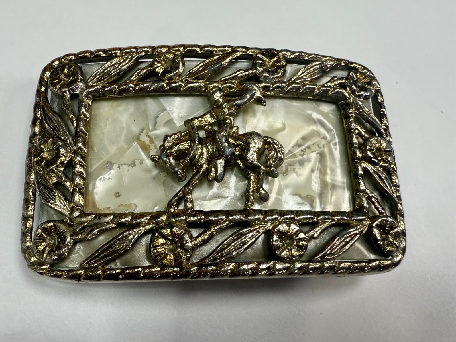 Bucking Bronco Horse Rider Raised on Background Western Rodeo Cowboy Belt Buckle