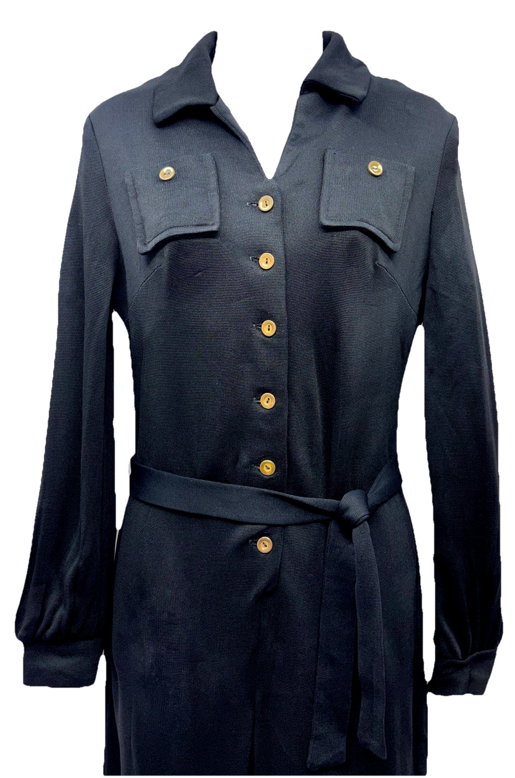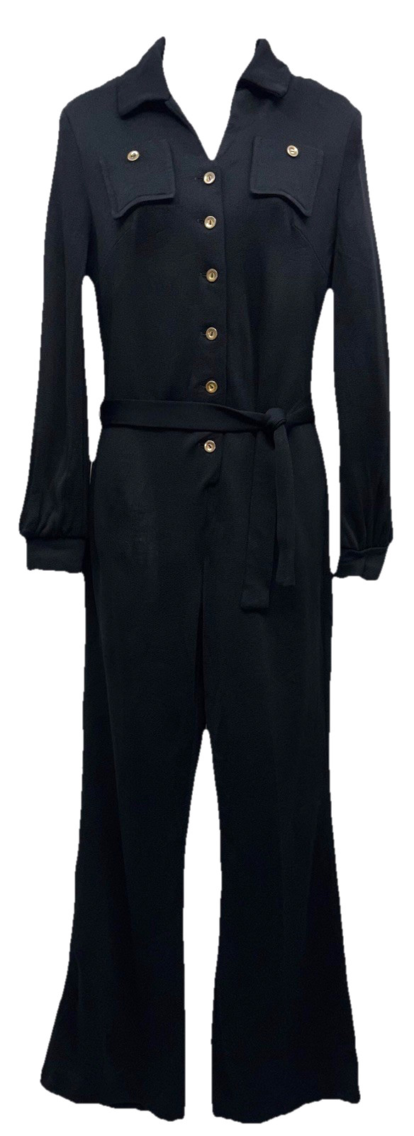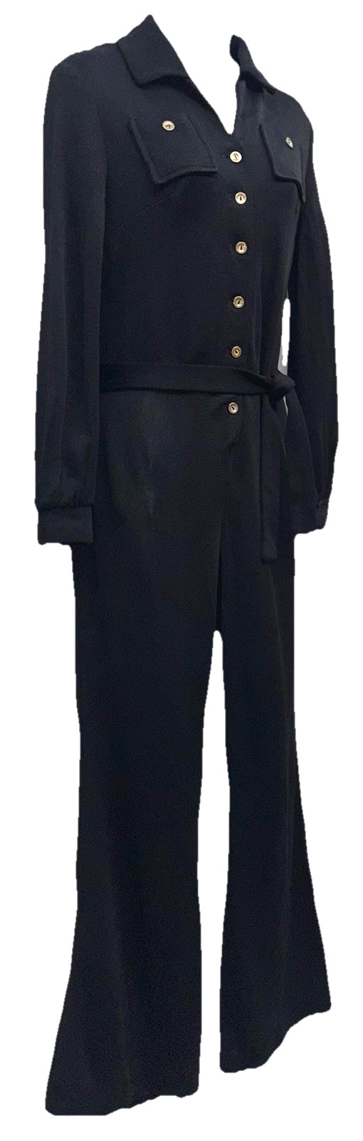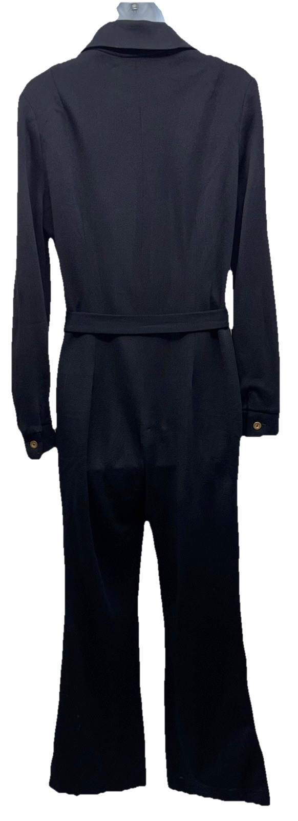 VTG Women Size 13 Button Up Long Sleeve Flare Leg Utility Jumpsuit Belted Black
