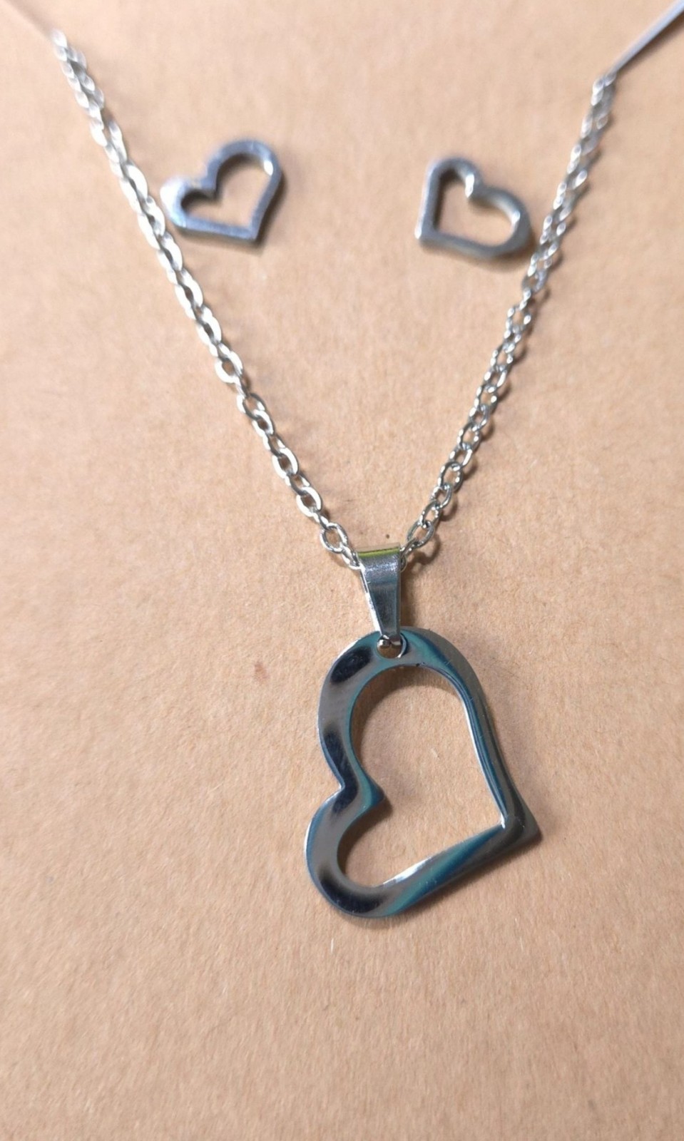 как выглядит Stainless Steel Heart Necklace Earrings Set 18 Silvertone Gift Box фото