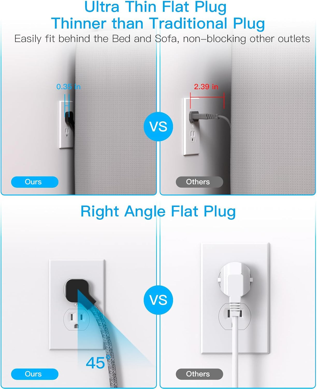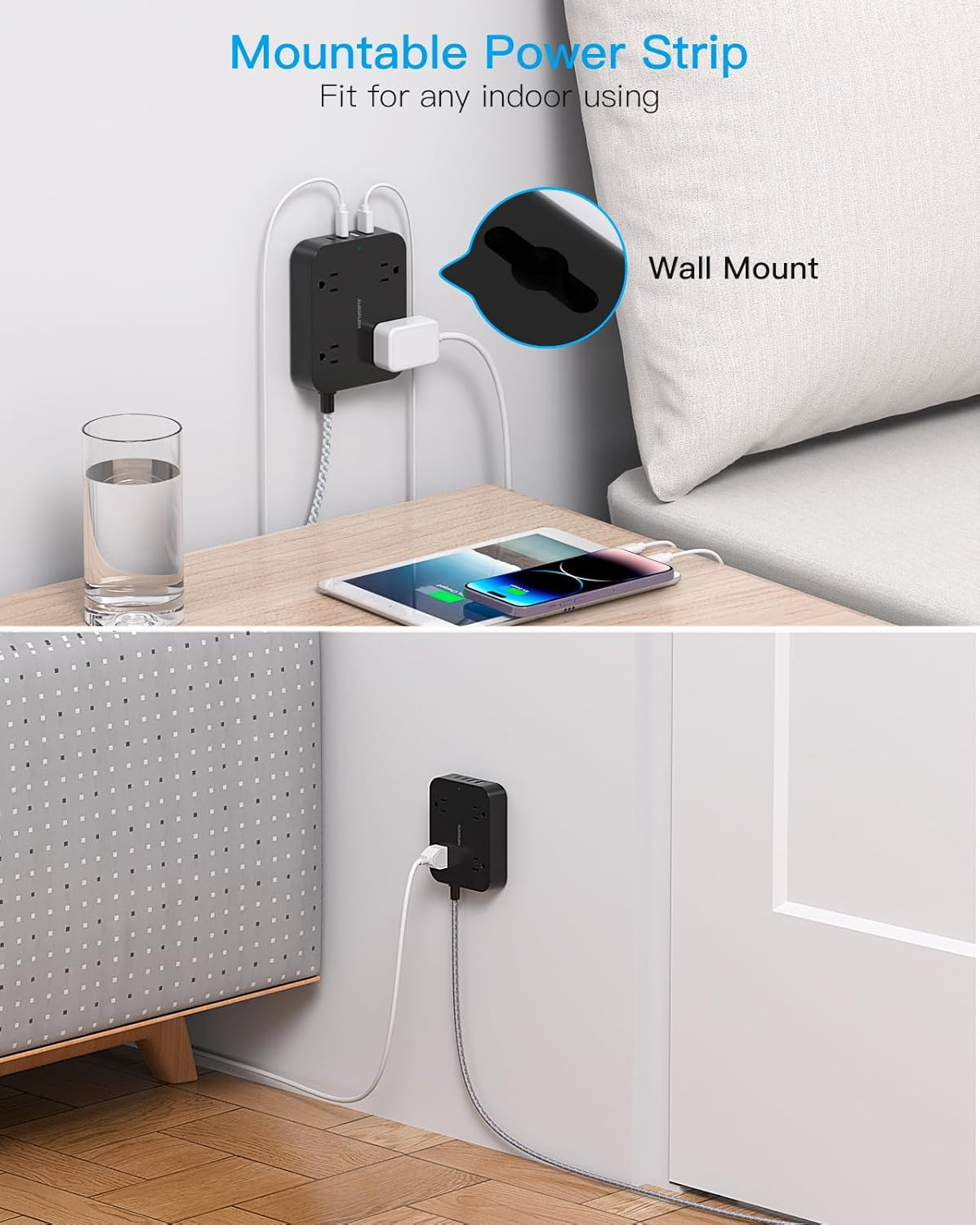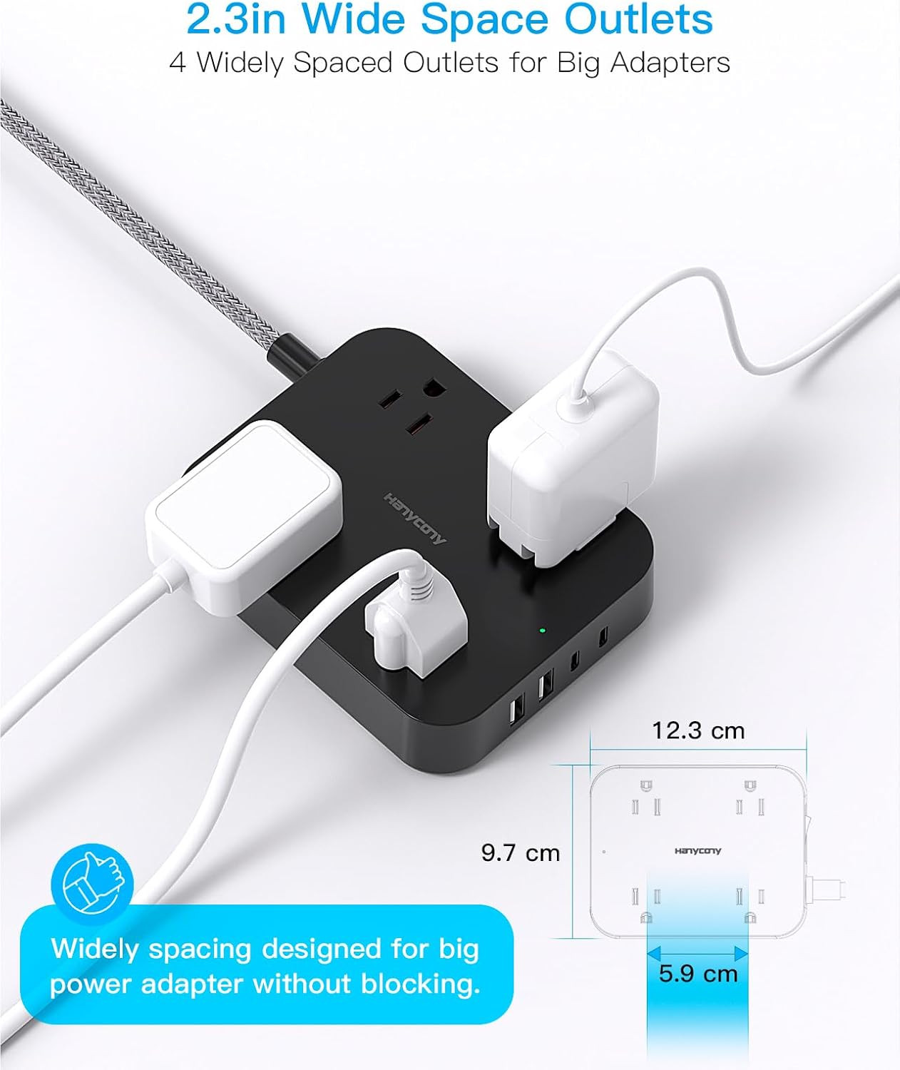Black Flat Plug Extension Cord, 5Ft Power Strip with 4 USB Ports 2 USB C , 4 Wi