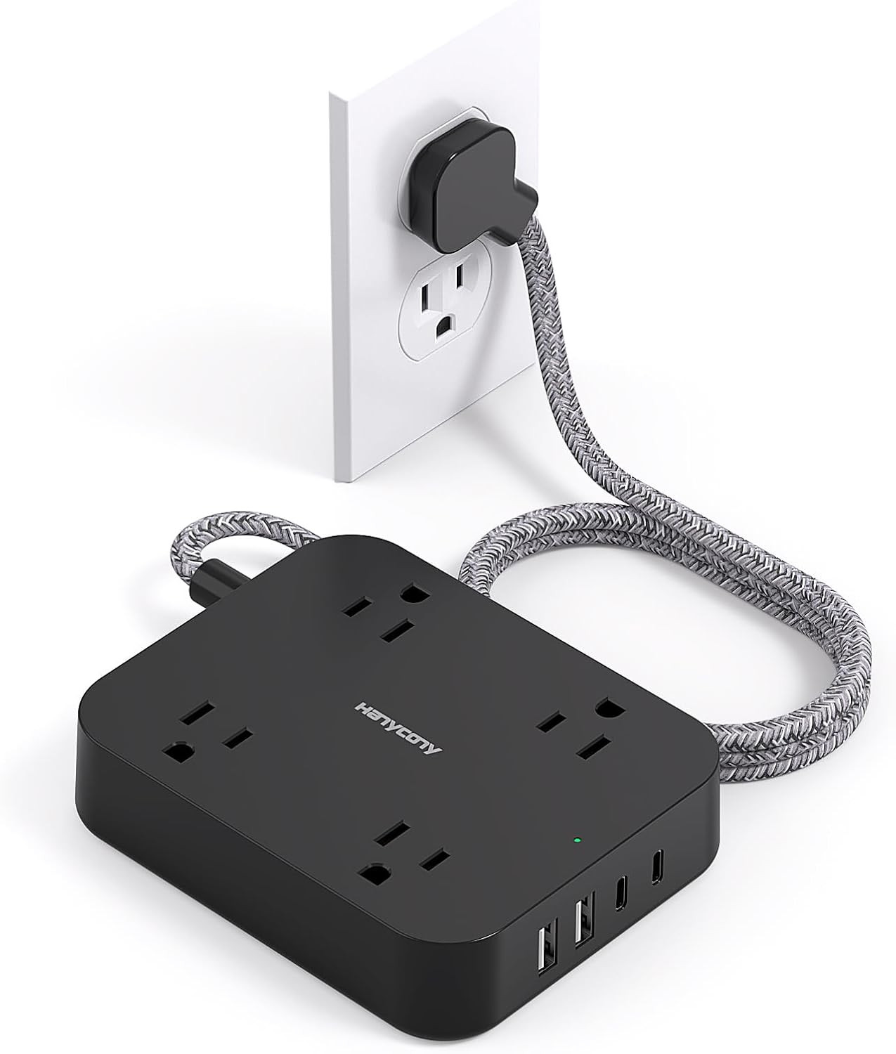 как выглядит Black Flat Plug Extension Cord, 5Ft Power Strip with 4 USB Ports 2 USB C , 4 Wi фото