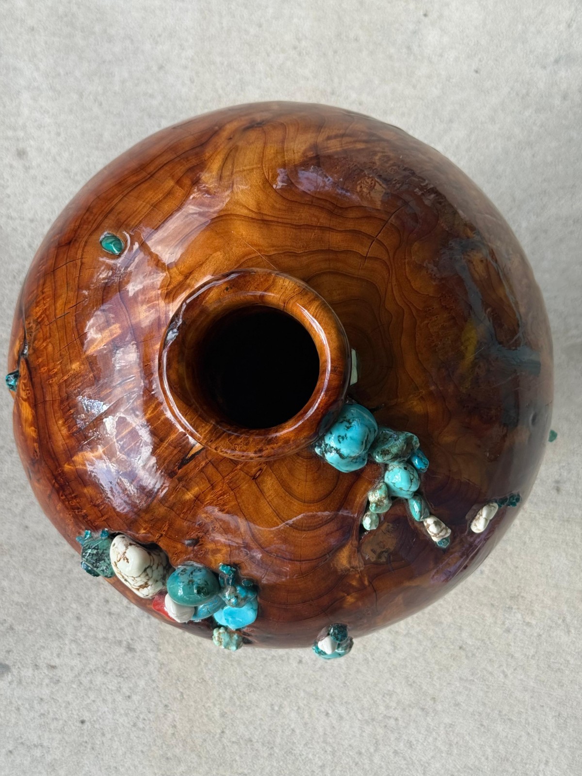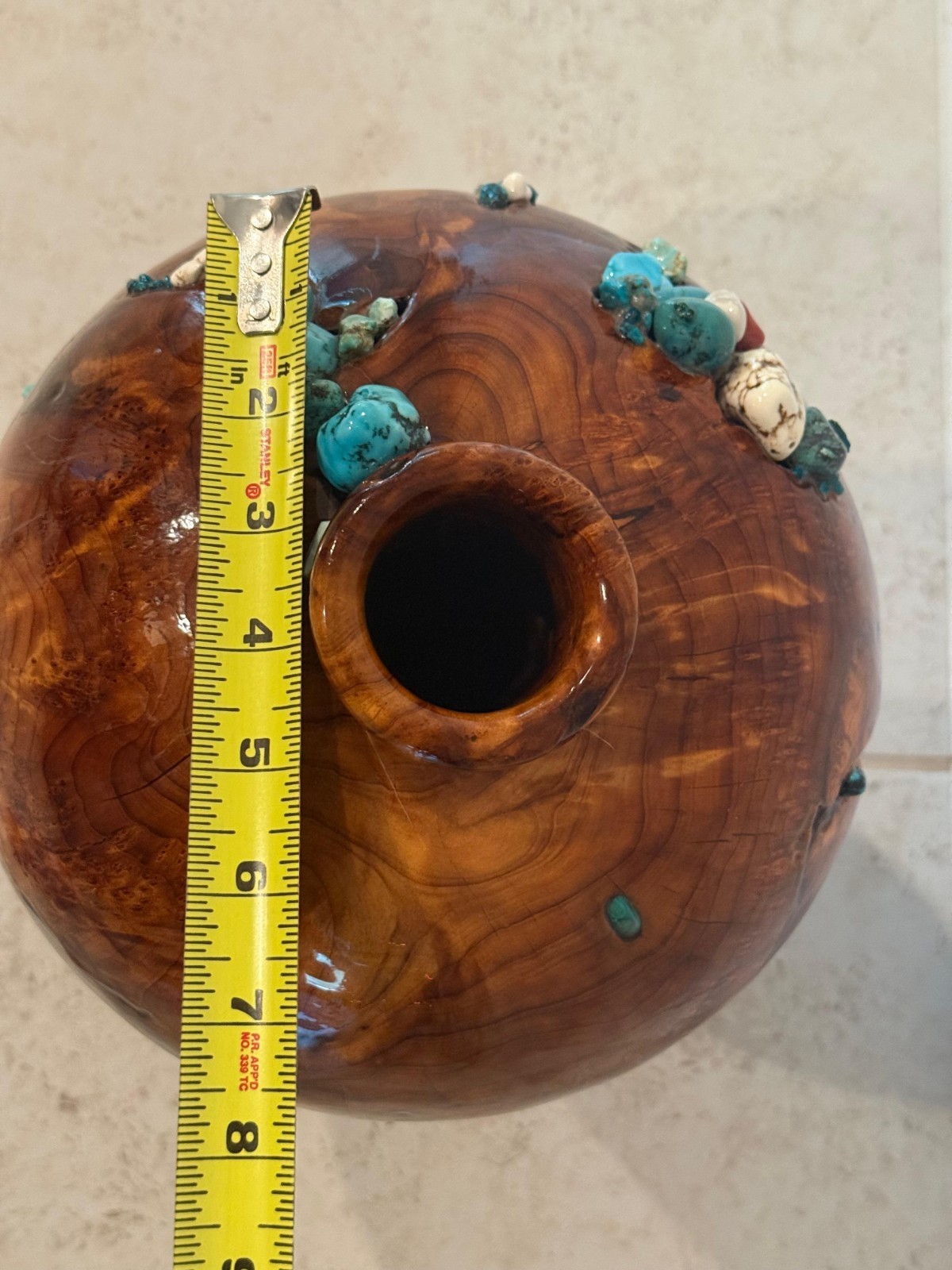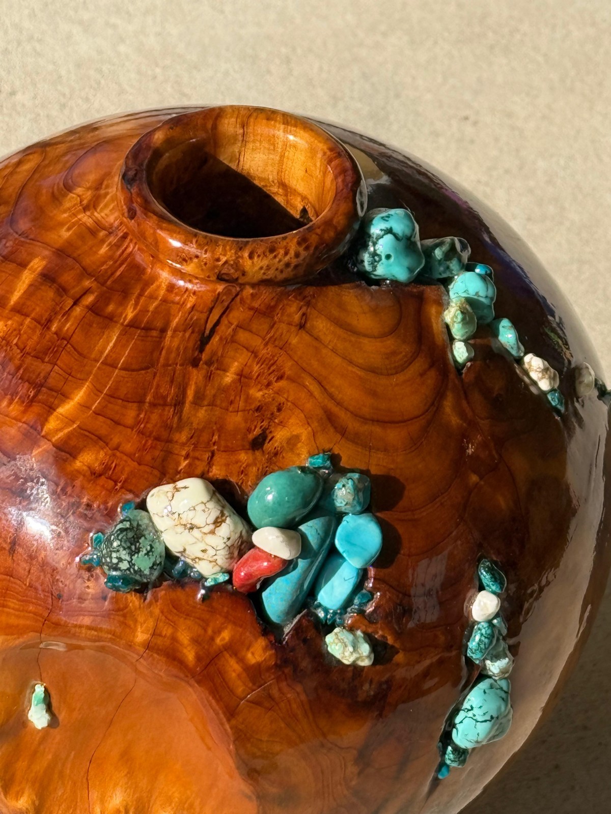 как выглядит Beautiful Unique Handcrafted Wood Vase With Turquoise Stones 14" Tall фото