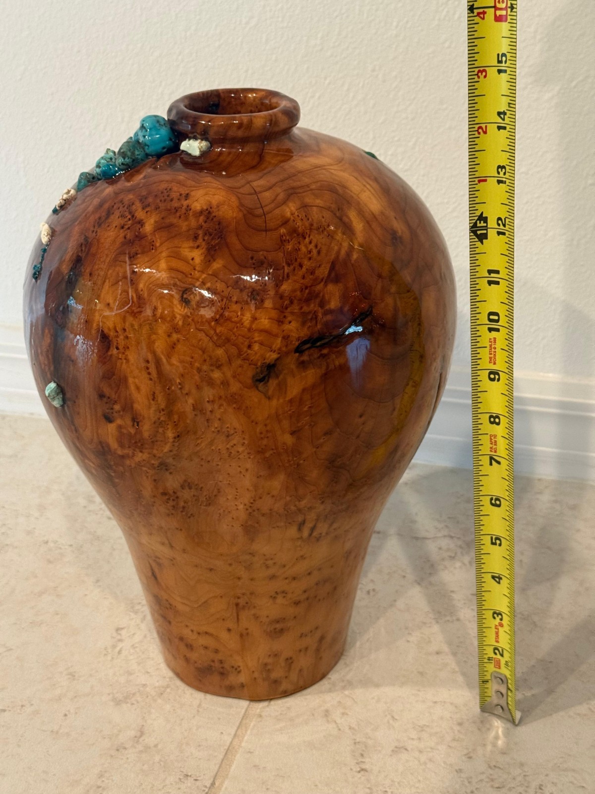 Beautiful Unique Handcrafted Wood Vase With Turquoise Stones 14 Tall
