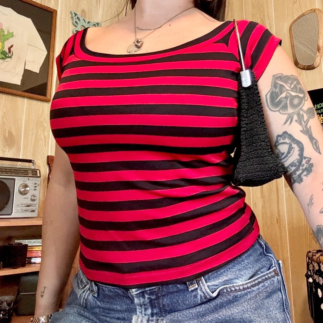 как выглядит Vintage Paris Blues Red and Black Stretch Striped Top 2000s фото