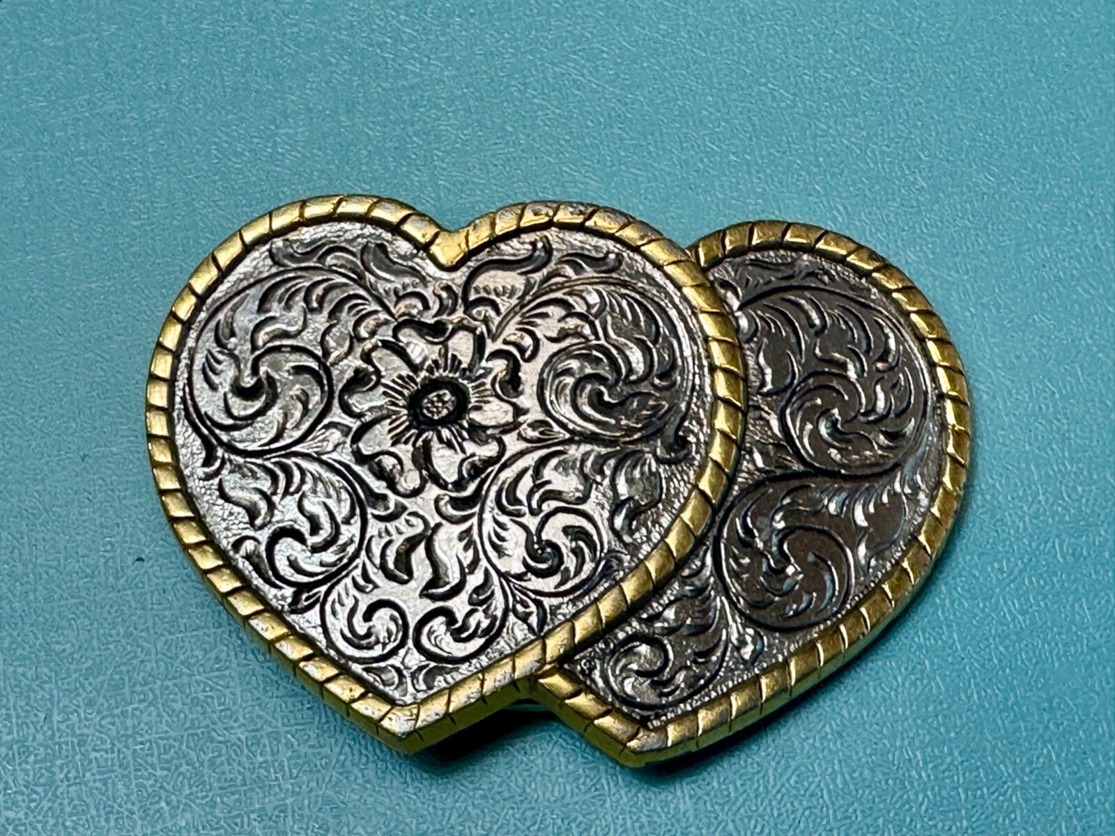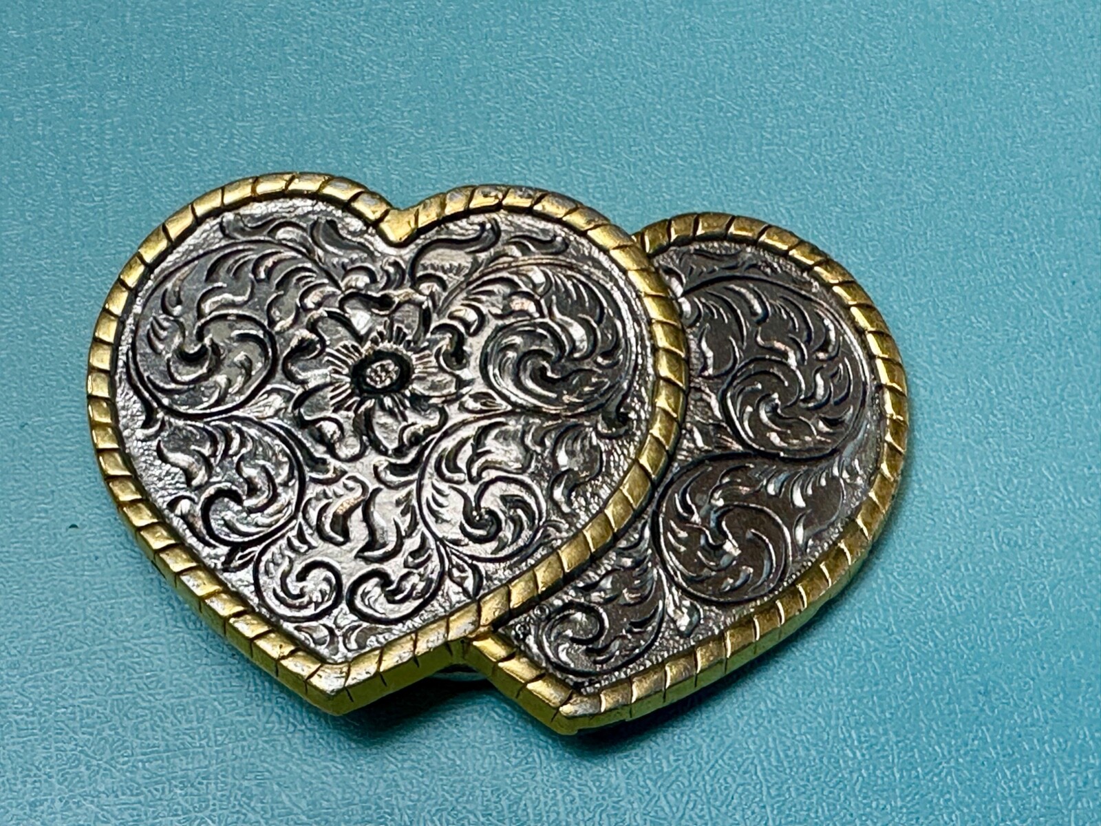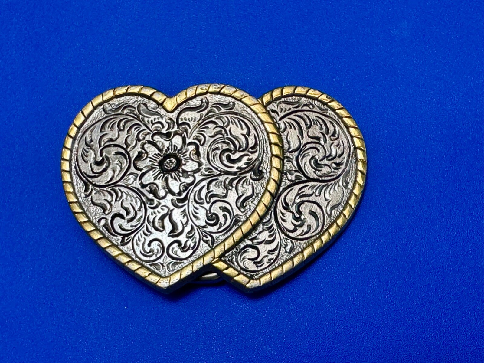 Dual Two Hearts Rope Outlined Flower Swirl Western Two Tone Belt Buckle By Adm