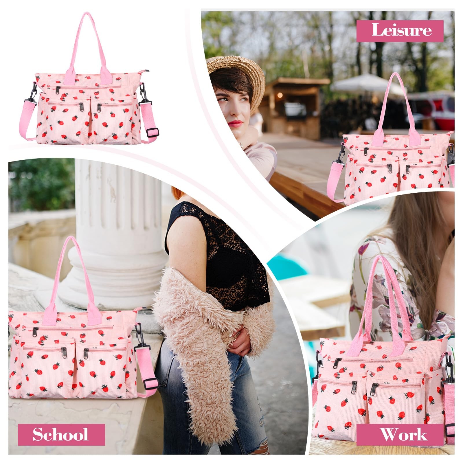 Pink Strawberry Tote Bag for Women Girls, Corduroy Everyday Tote Bag with Mul...