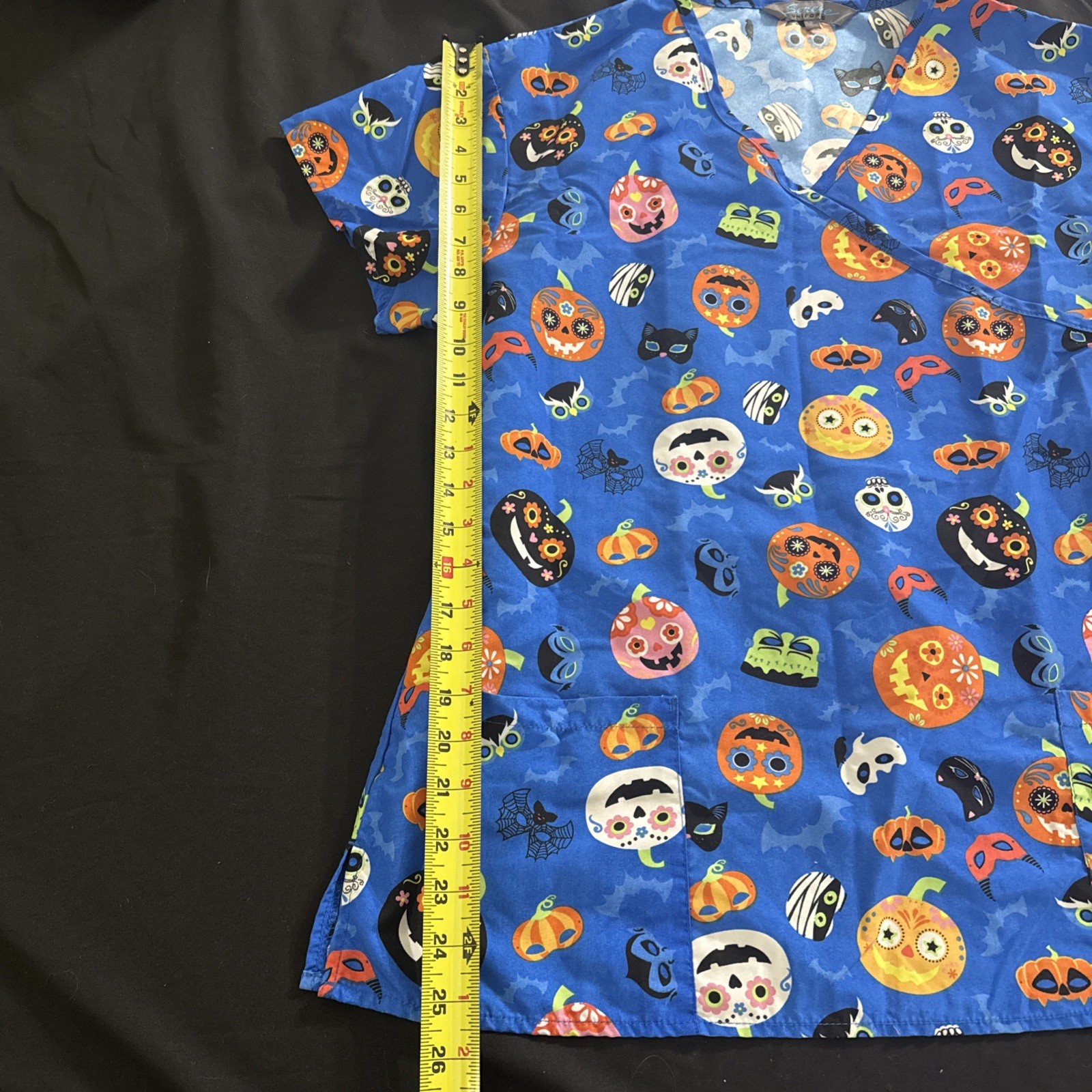 Serene Uniforms Halloween Scrub Top Size Large Blue Ghost Cat Pumpkin Print ECU