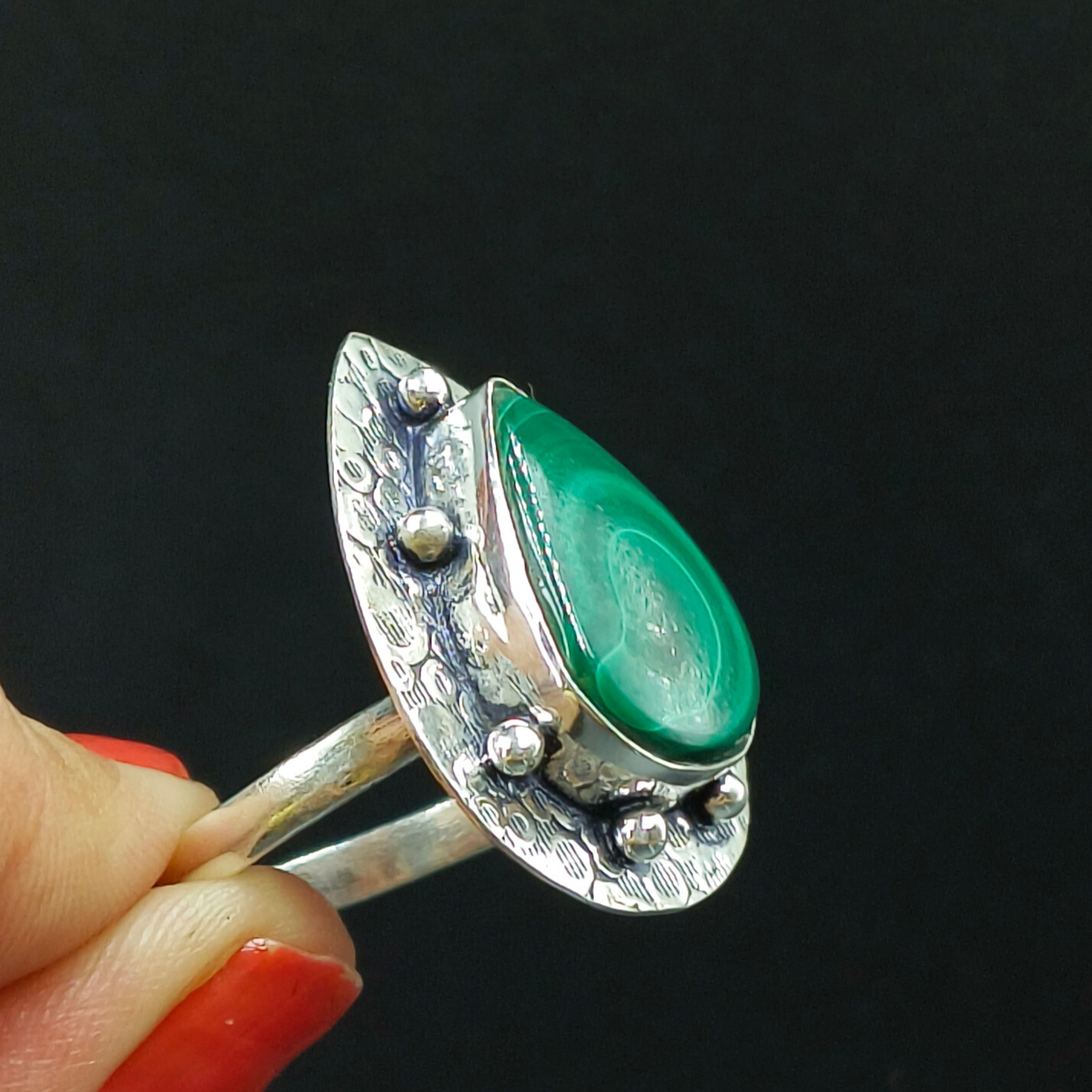 Natural Malachite Pear Gemstone 925 Sterling Silver Adjustable Ring