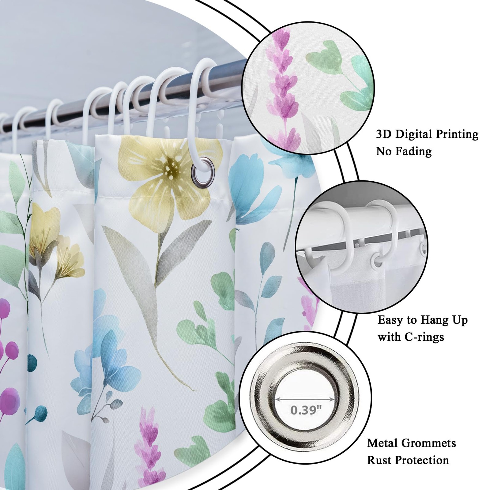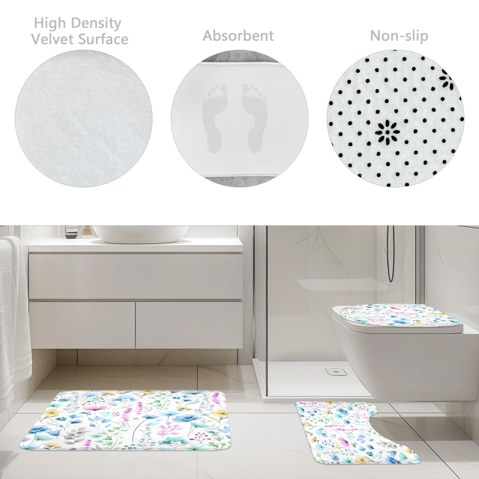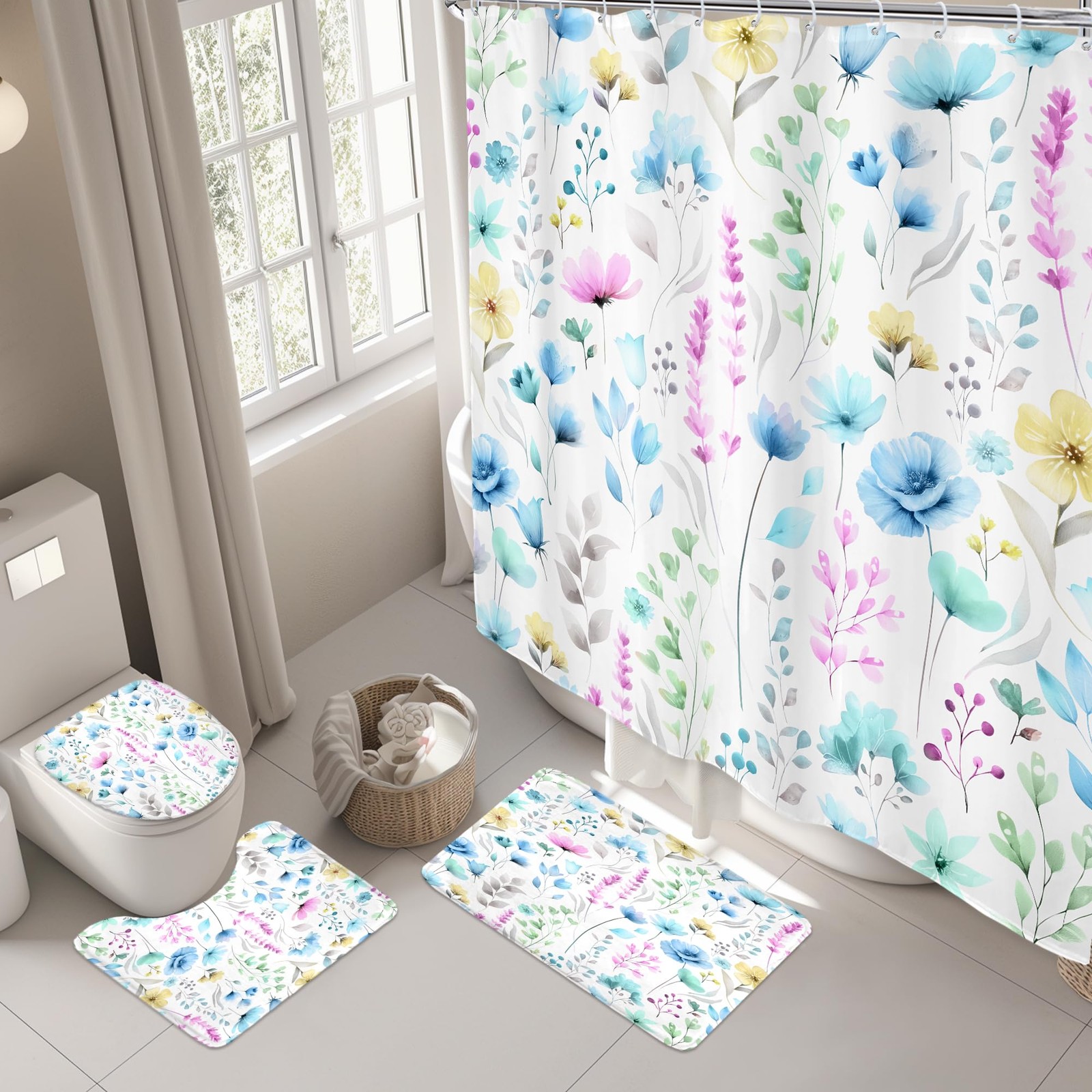 Blue Floral Girls 4Pcs Shower Curtain Set with Lid Cover and Non-Slip Rugs,Fl...
