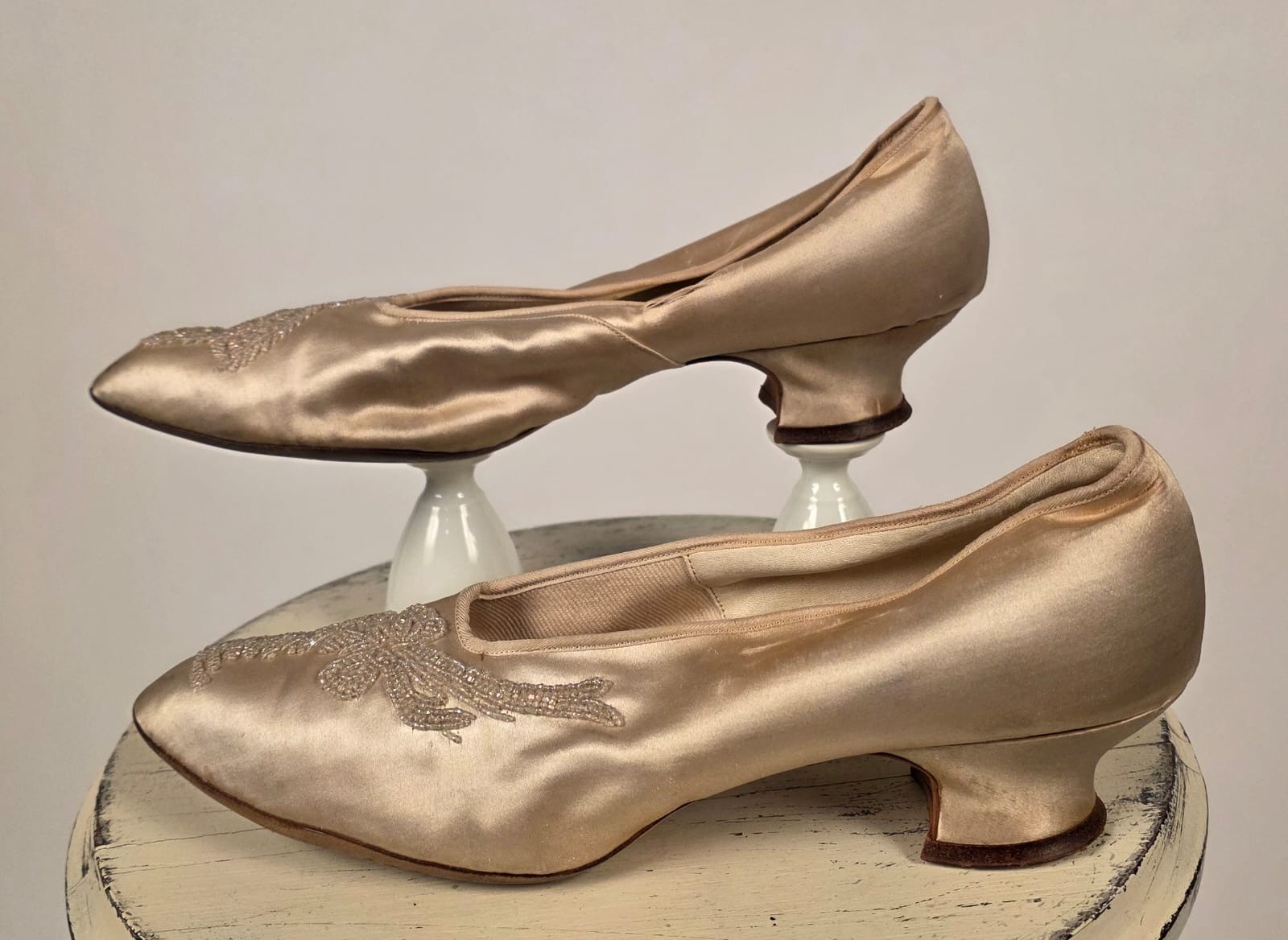 VICTORIAN 19TH C SILK SATIN WEDDING SHOES W BEAUTIFUL BEADING - AS ACQUIRED
