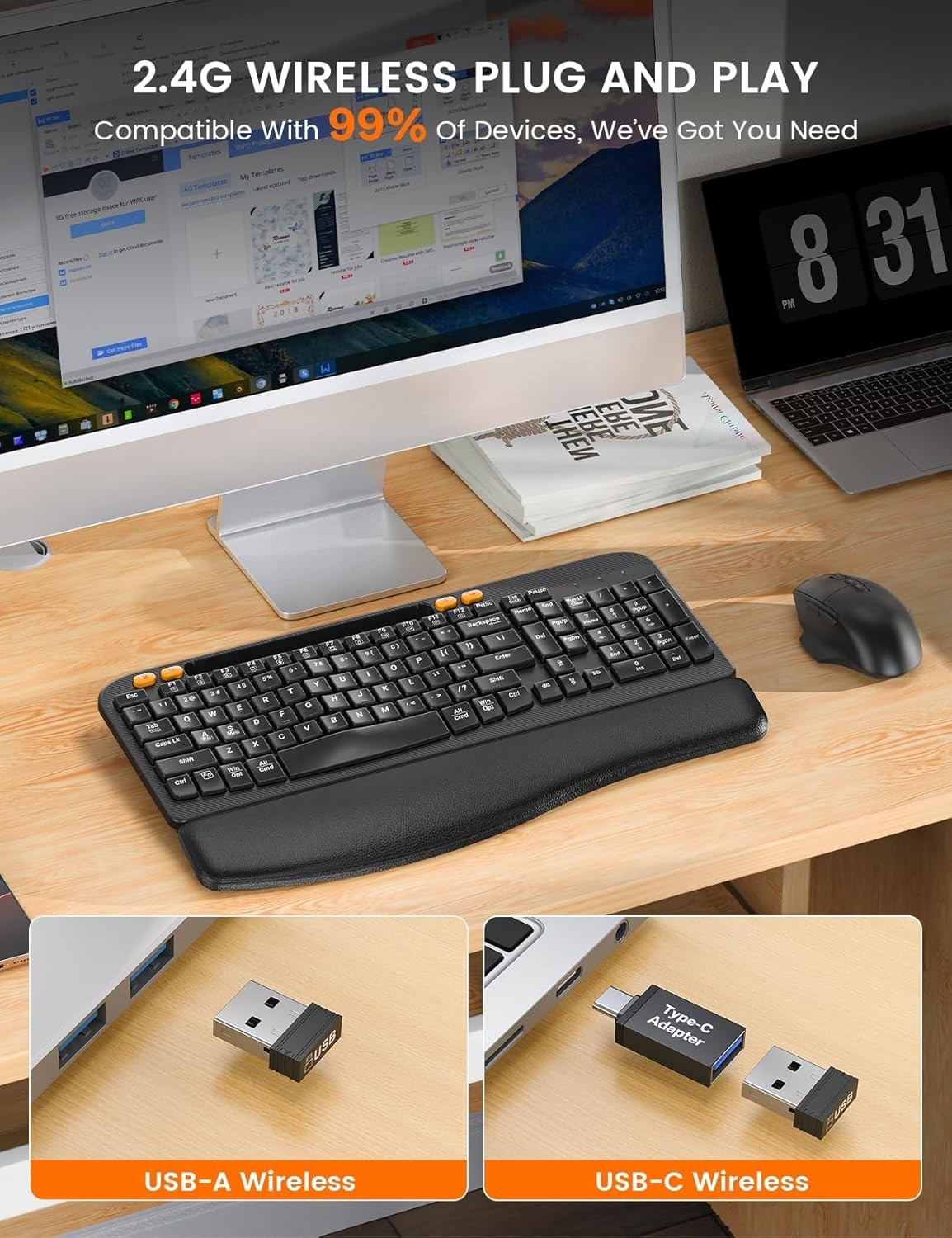 Wireless Keyboard and Mouse Combo, Ergonomic Wave Keys, Cushioned Palm Rest, Rec