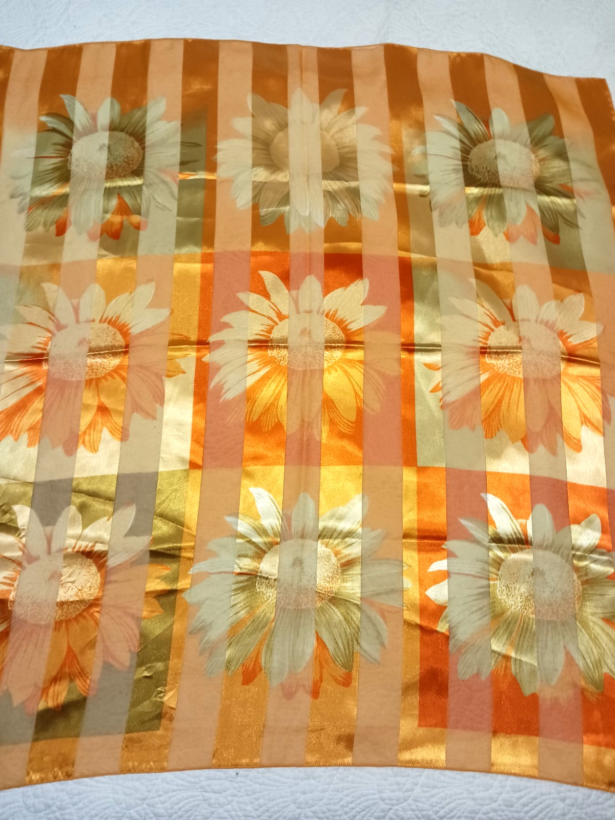 как выглядит Large Vintage 1980s Satin Scarf Vibrant Sunflowers on Orange Tan Stripes 40x40" фото