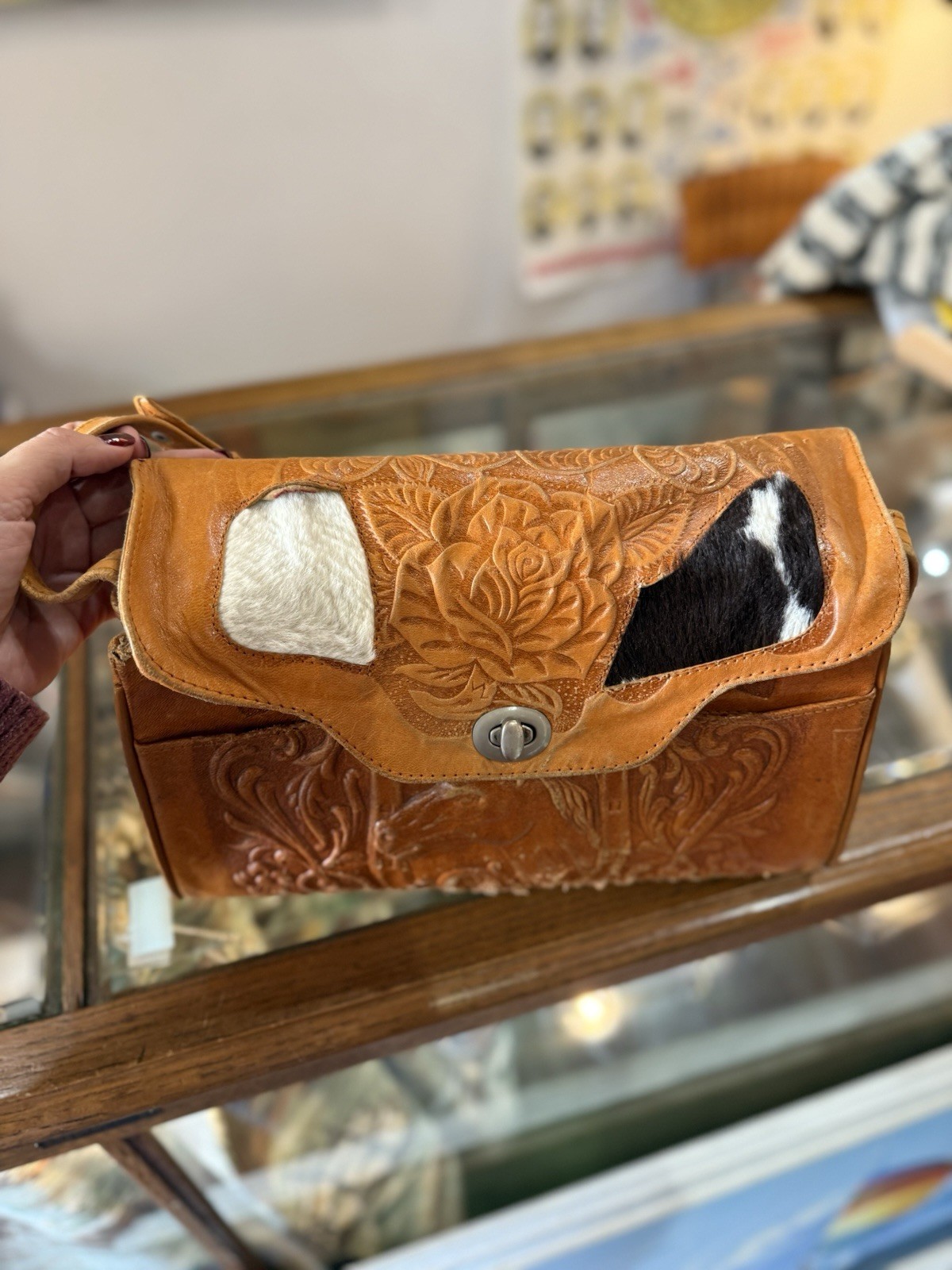 как выглядит Vintage Hand Tooled Leather Purse Cross Body Bag With Horse Motif And Cowhide фото