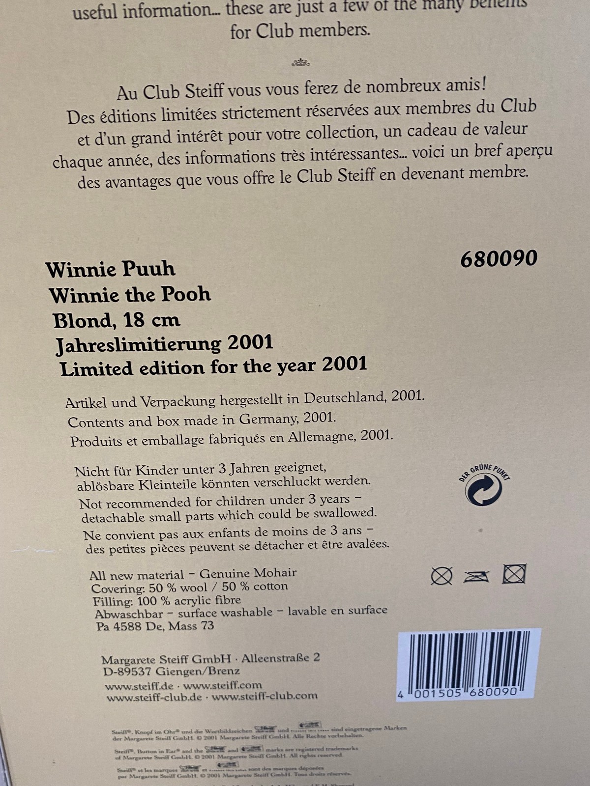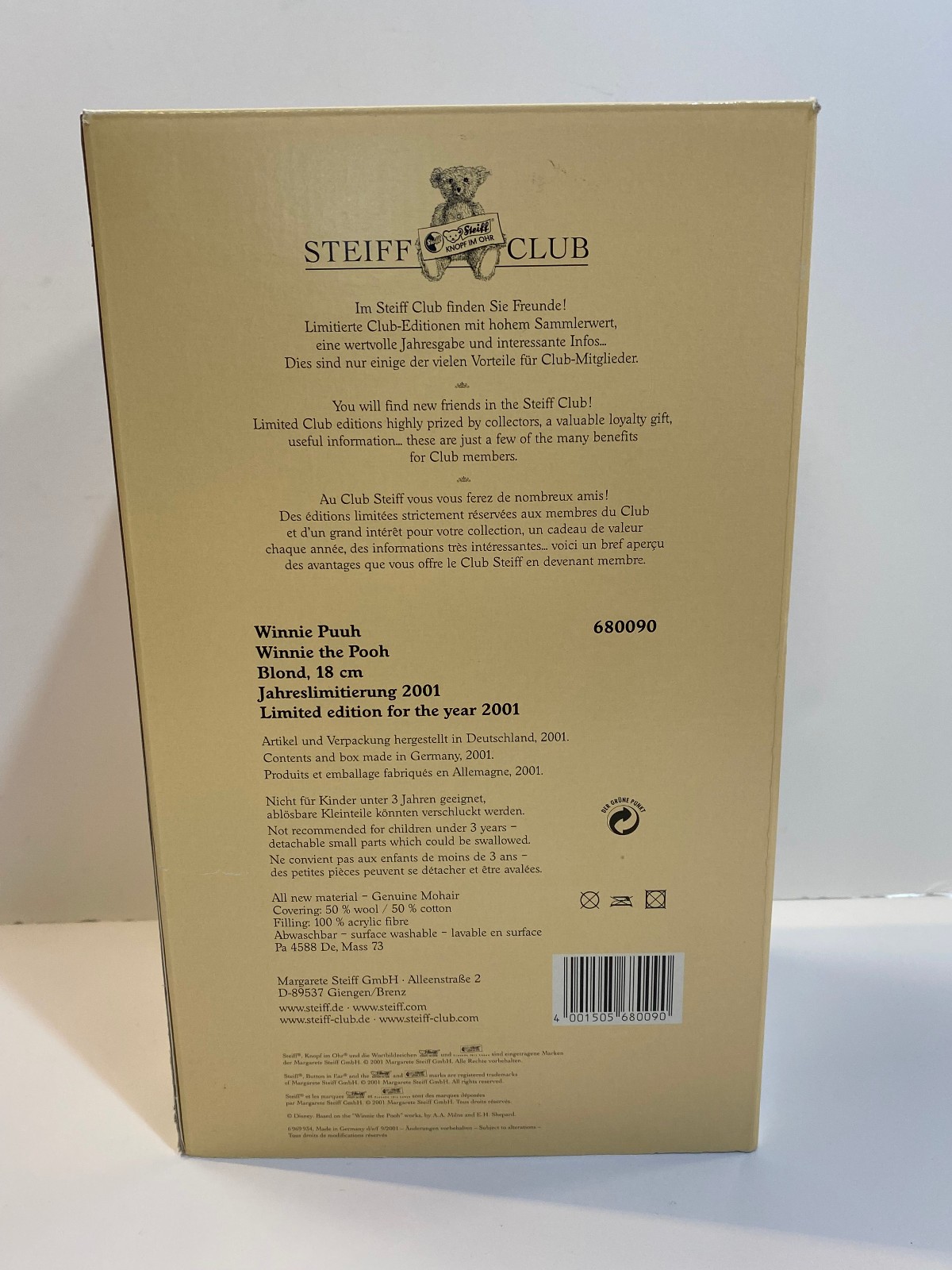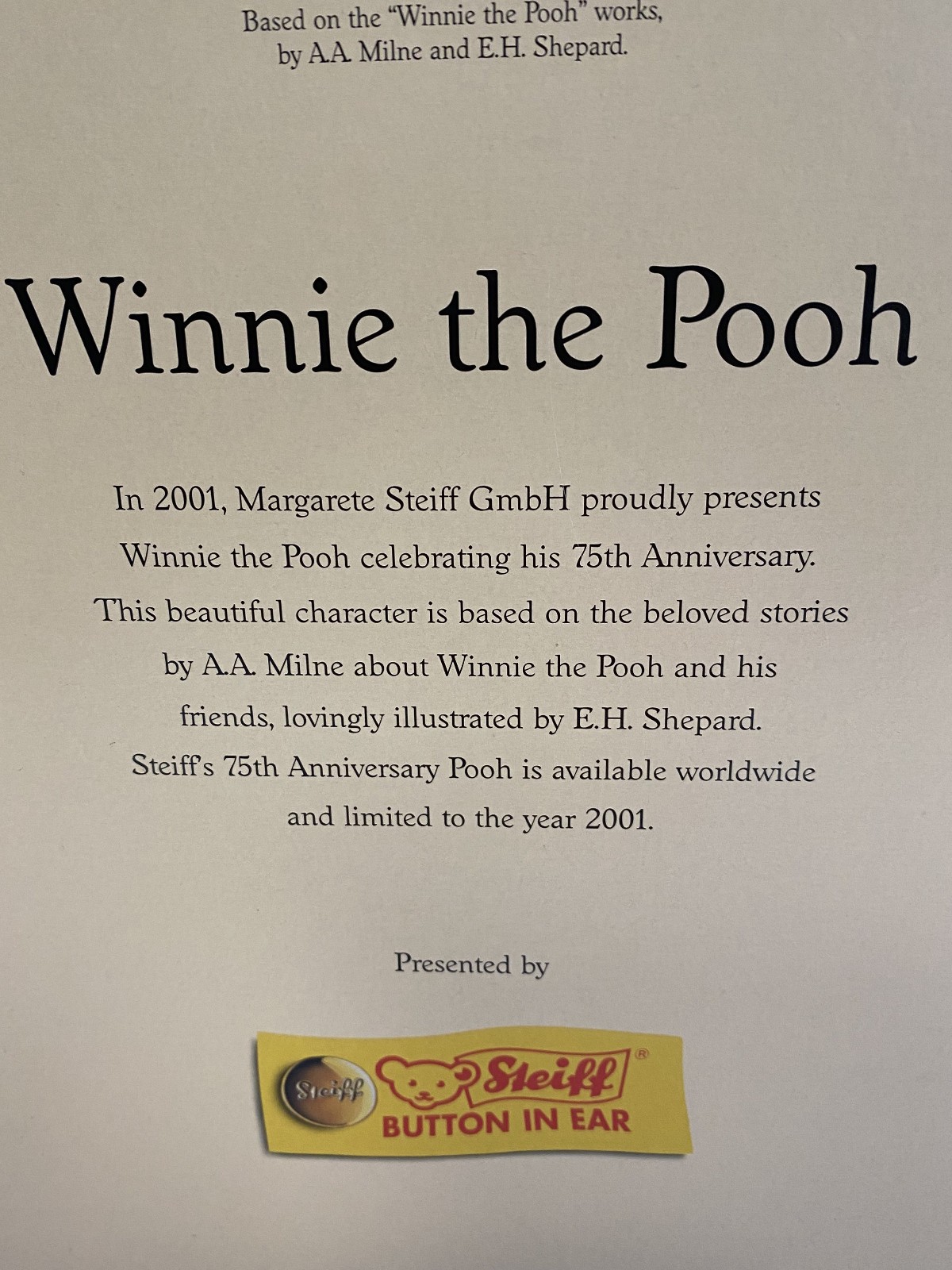 Steiff Club 75th Anniversary Winnie the Pooh Mohair Plush Bear Disney 680090