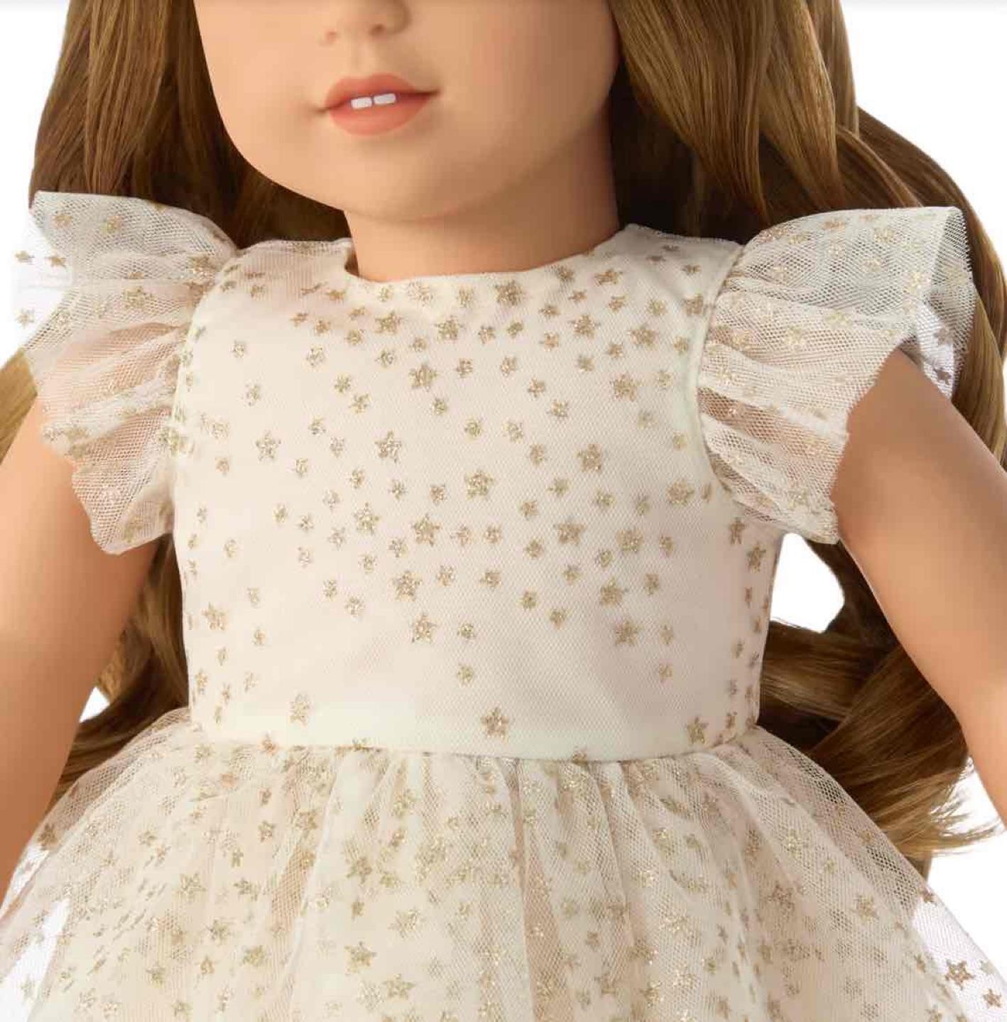 как выглядит American Girl Janie and Jack Sparkly Cream Celebration Outfit Dress Gold Shoes фото