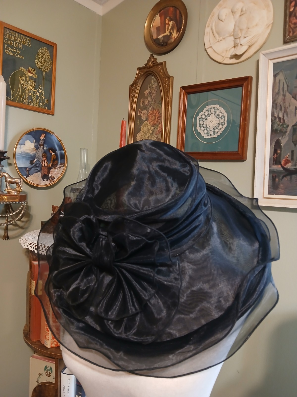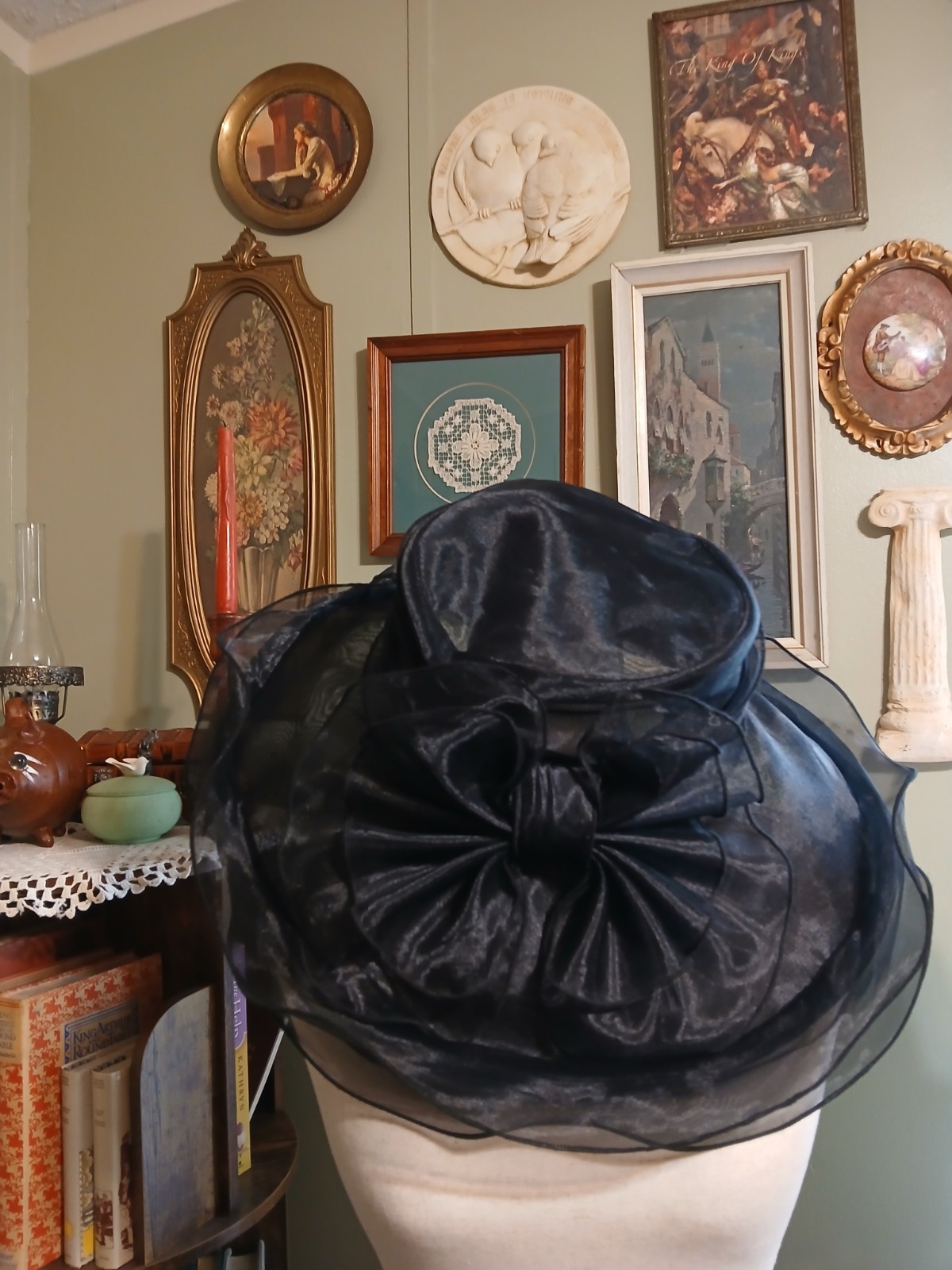 как выглядит Vintage Lace Chiffon Ruffle Layered black derby hat wide brim Bow 1980s Banquet фото